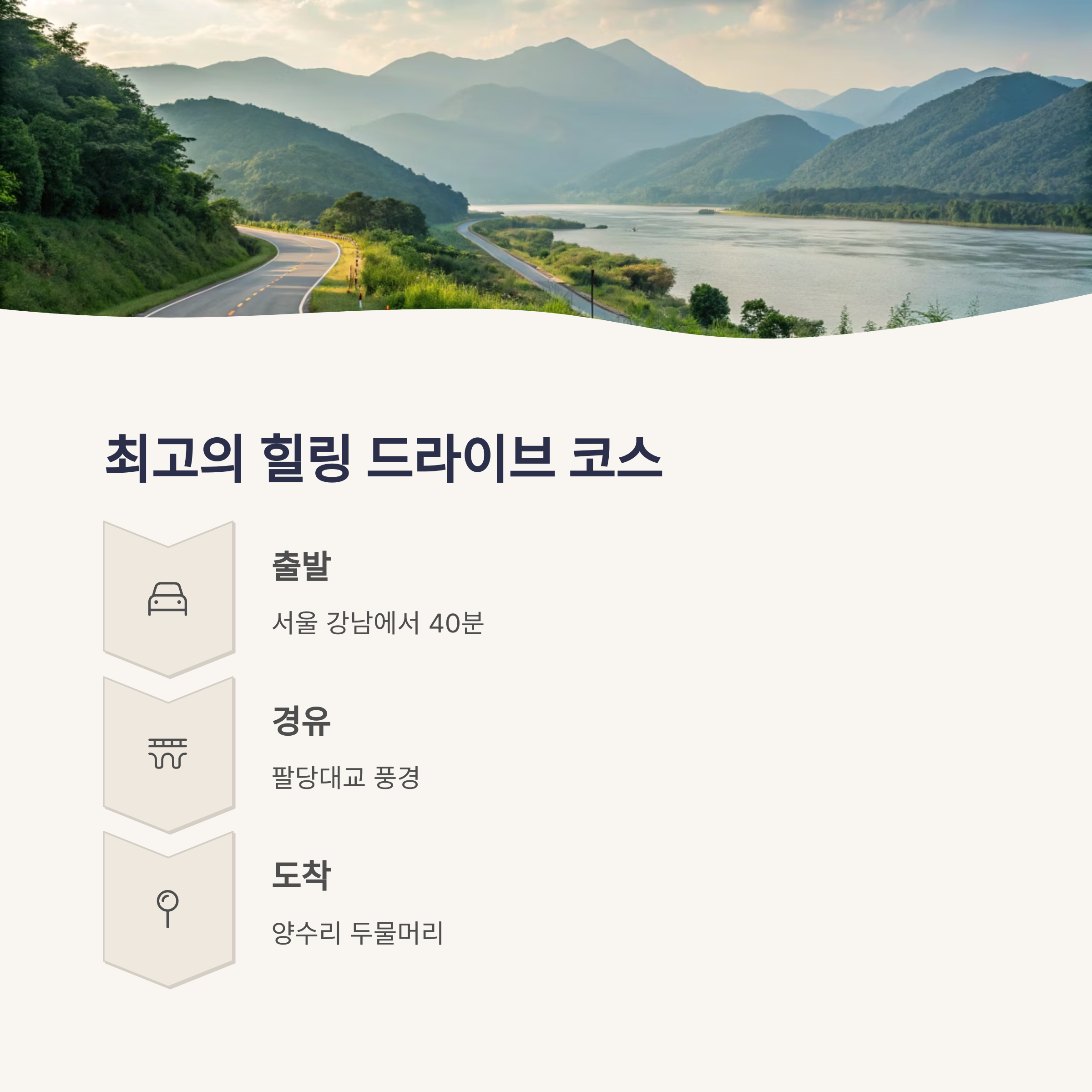 서울에서 차로 1시간 남짓, 팔당대교와 양수대교를 따라 이어지는 강변도로는 드라이브의 정석 코스입니다