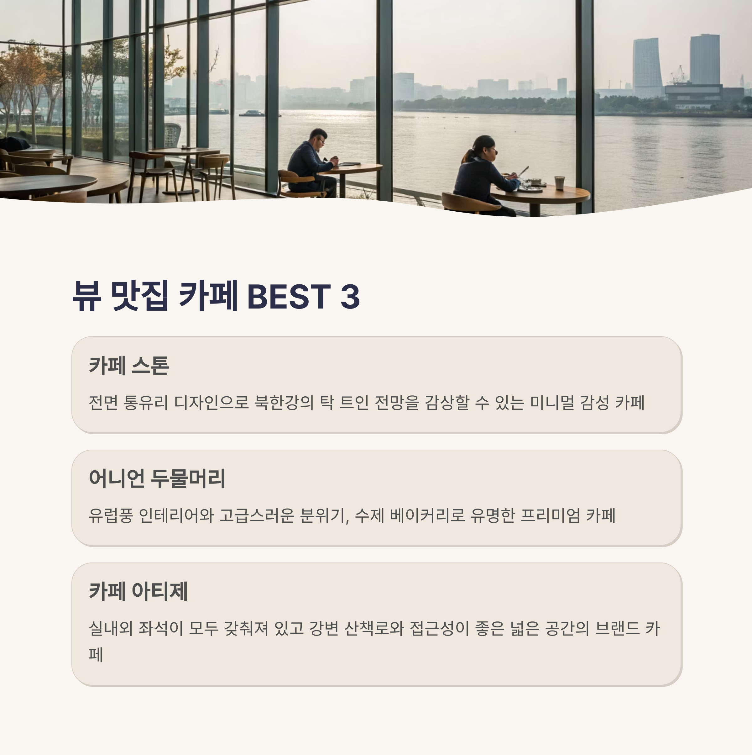 특히 도로 양옆으로 펼쳐지는 풍경과 탁 트인 강변 뷰가 인상적입니다