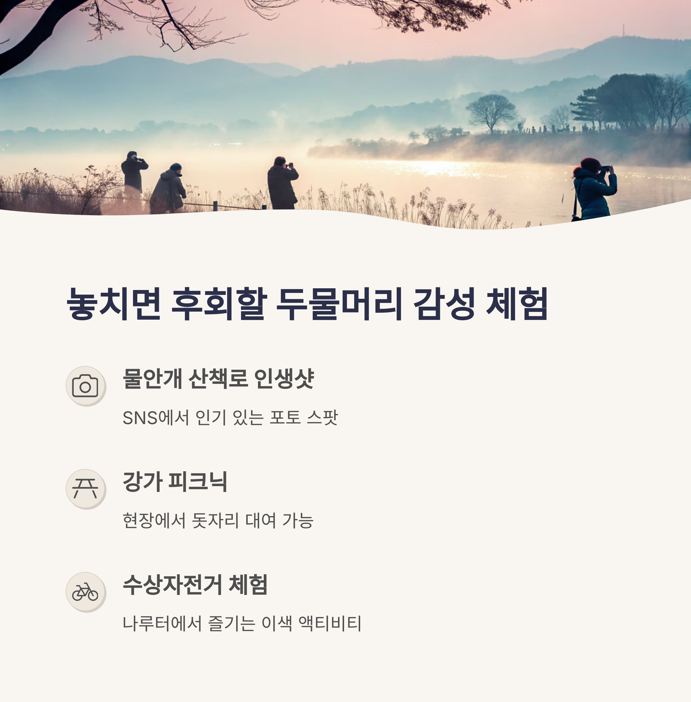 두물머리는 북한강과 남한강이 만나는 곳으로, 사계절 내내 아름다운 자연 풍경을 자랑합니다