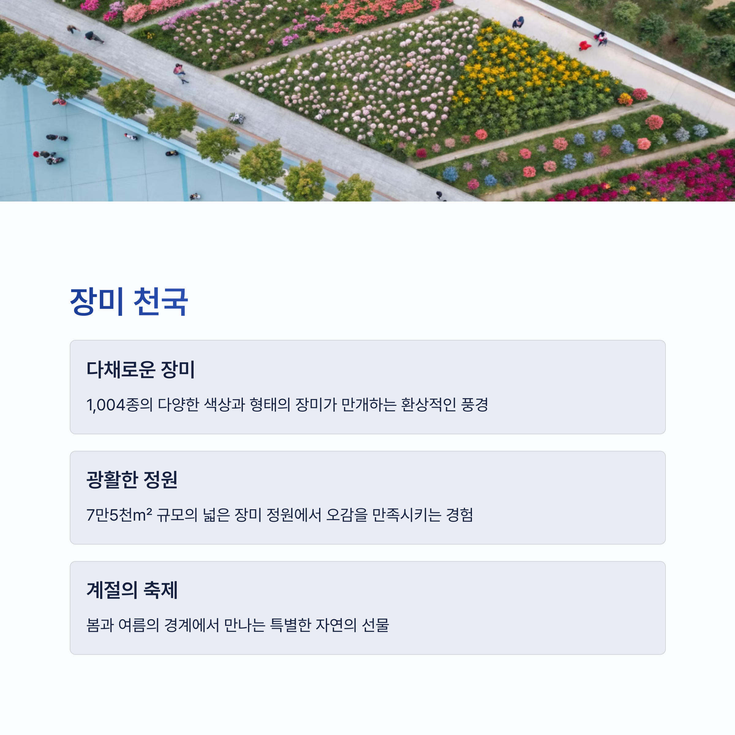 약 1,004종의 장미가 전시되어 있어 다양한 색과 형태를 경험할 수 있습니다.