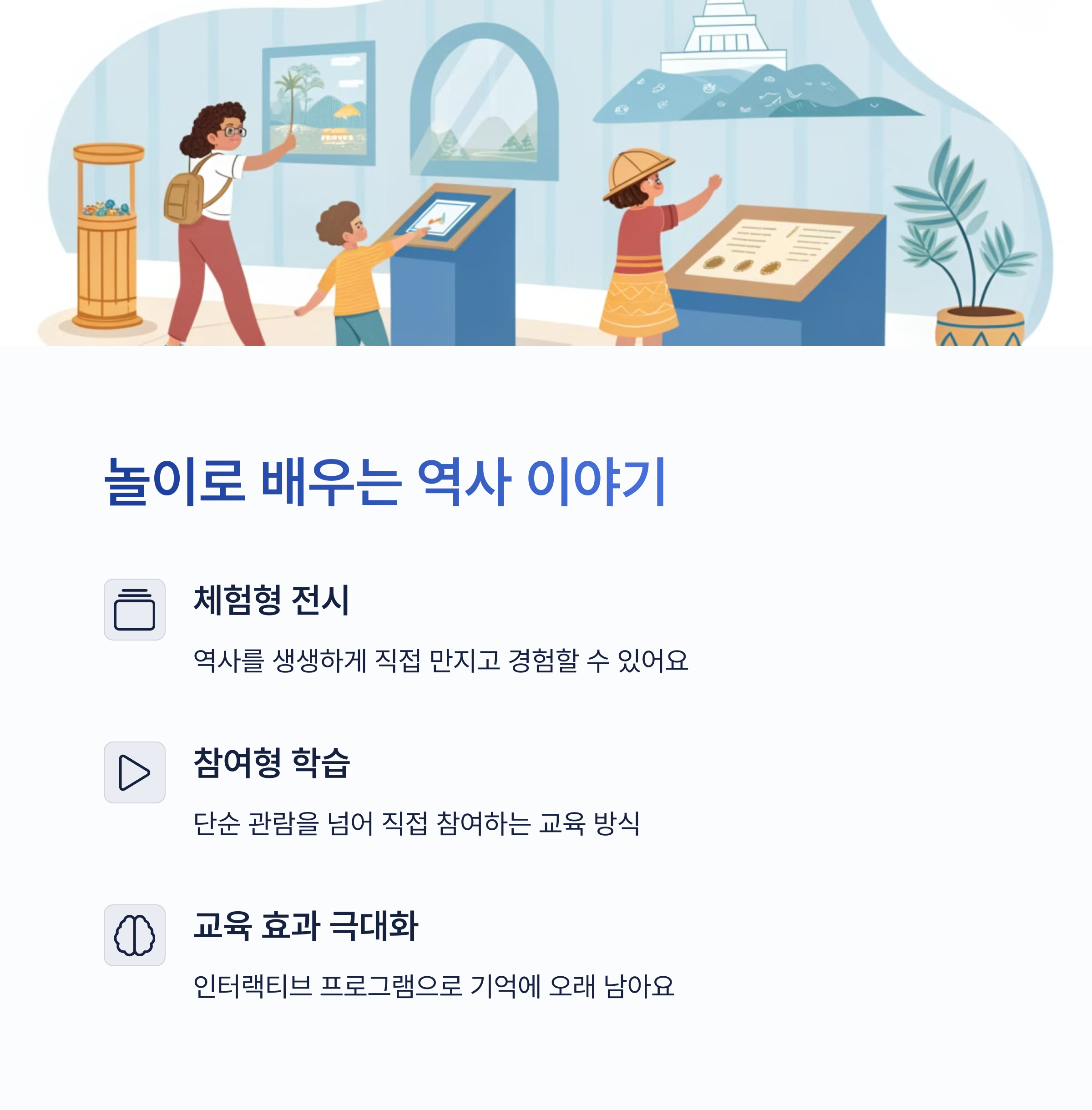 | 전통문화, 역사, 선사시대 콘텐츠 전시 | 박물관 홈페이지 통해 신청 가능 | 놀이 중심 체험으로 몰입도 높은 교육 가능 |