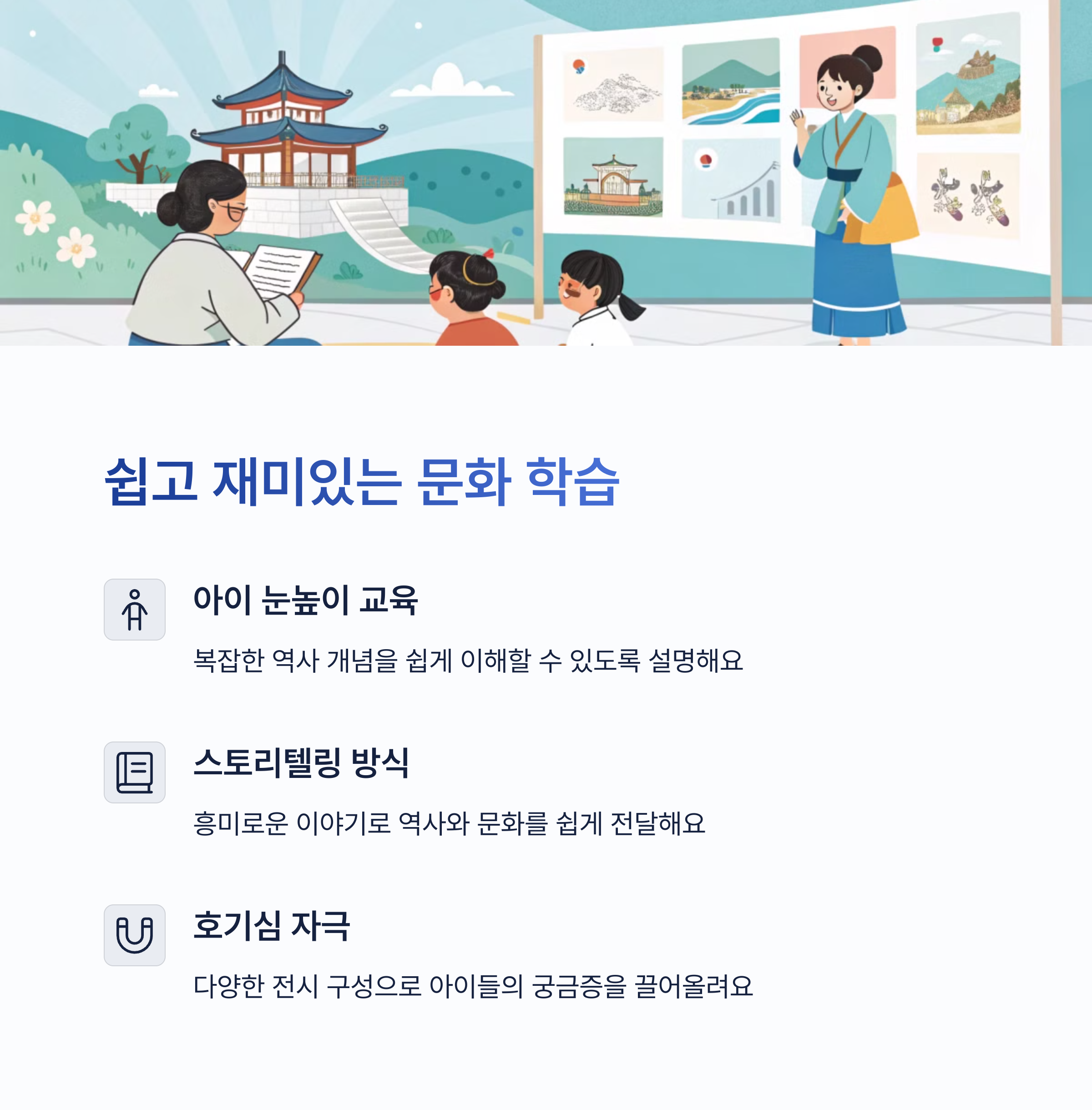 단순히 전시를 관람하는 방식이 아니라, 어린이 눈높이에 맞춘 체험형 전시와 학습활동으로 구성되어 있어 교육적인 효과가 매우 높습니다. 전통 유물도 만져보고, 놀이를 통해 한국사의 흐름을 이해할 수 있어 많은 학부모님들의 만족도가 높죠.
