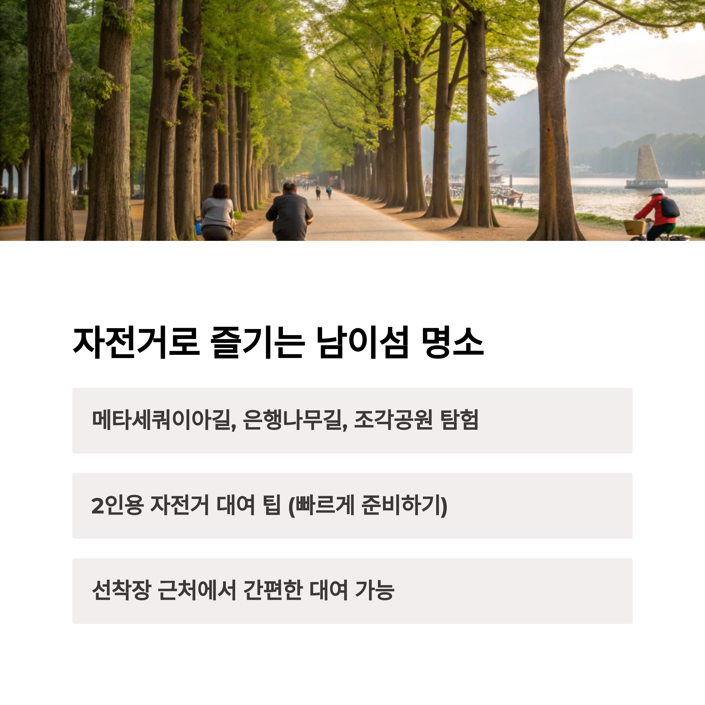 | 4월 중순, 평일 오전 추천 | 선착장 인근, 2인 자전거 인기 | 은행나무길, 메타세쿼이아길, 조각공원 |
