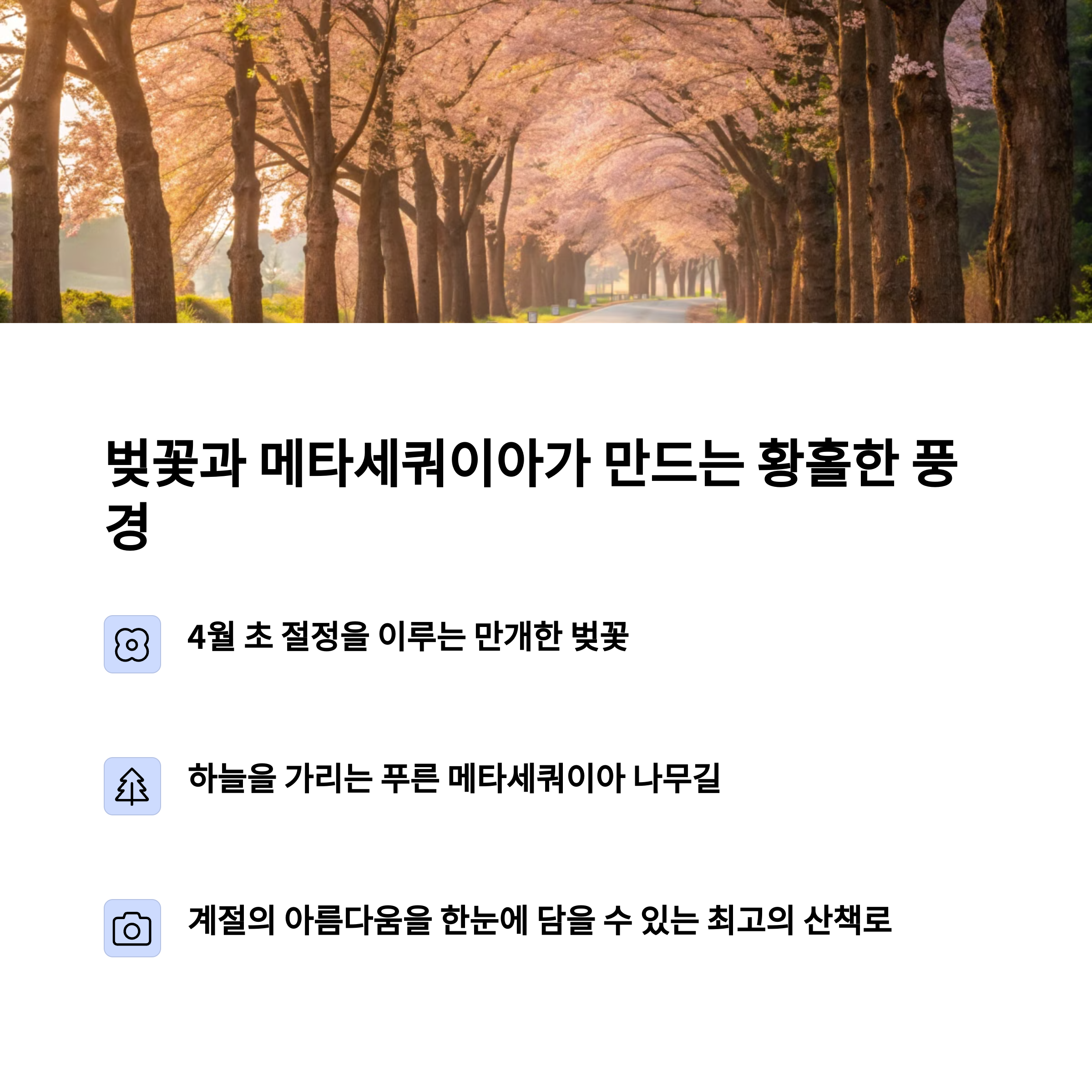 바람에 흩날리는 연분홍 잎사귀와 함께 걷는 그 길은 마치 영화 속 한 장면처럼 느껴질 만큼 낭만적인 풍경을 선사합니다. 특히 봄이 되면 담양 메타세쿼이아길은 수많은 여행객의 발걸음을 이끄는 특별한 장소로 손꼽히죠. 따뜻한 햇살과 함께 펼쳐지는 길고 고요한 산책로, 그 끝에 기다리는 인생샷 명소들이 가득해 여행을 좋아하는 사람이라면 한 번쯤은 꼭 들러야 할 곳이에요. 힐링과 사진, 두 마리 토끼를 모두 잡고 싶은 분들께 이번 포스팅이 유용한 가이드가 되길 바랍니다. 지금부터 함께 담양 메타세쿼이아길의 봄 감성을 따라가 보실까요?