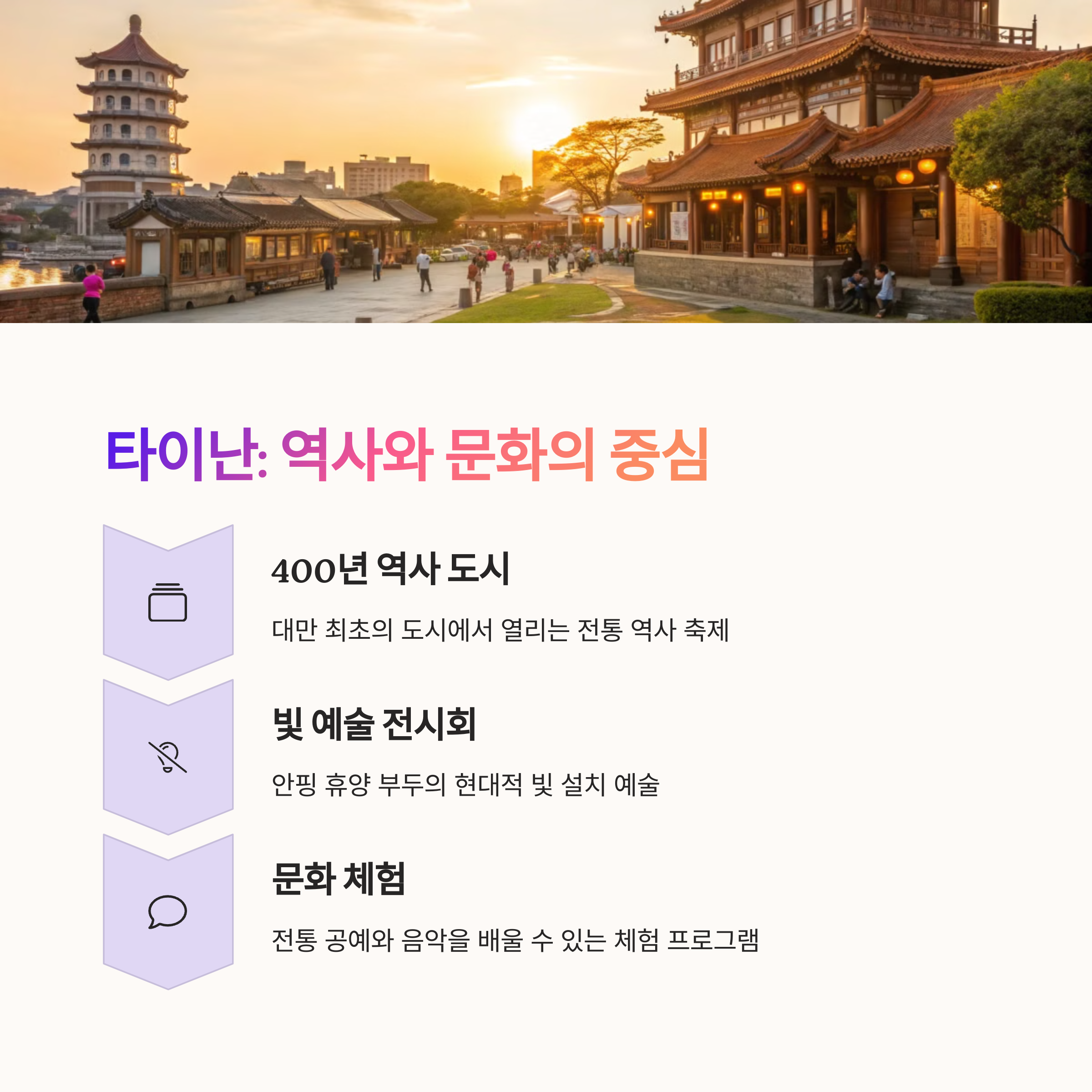 타이난에서는 봄맞이 예술제가 열리며, 전통 공연과 현대 미술이 공존하는 특별한 분위기를 선사하죠. 이처럼 대만의 각 지역에서는 서로 다른 테마와 색깔을 가진 축제가 줄줄이 펼쳐지기 때문에, 하나의 도시만 여행하는 것이 아니라, 일정에 따라 다양한 지역을 방문하는 것을 추천드립니다.