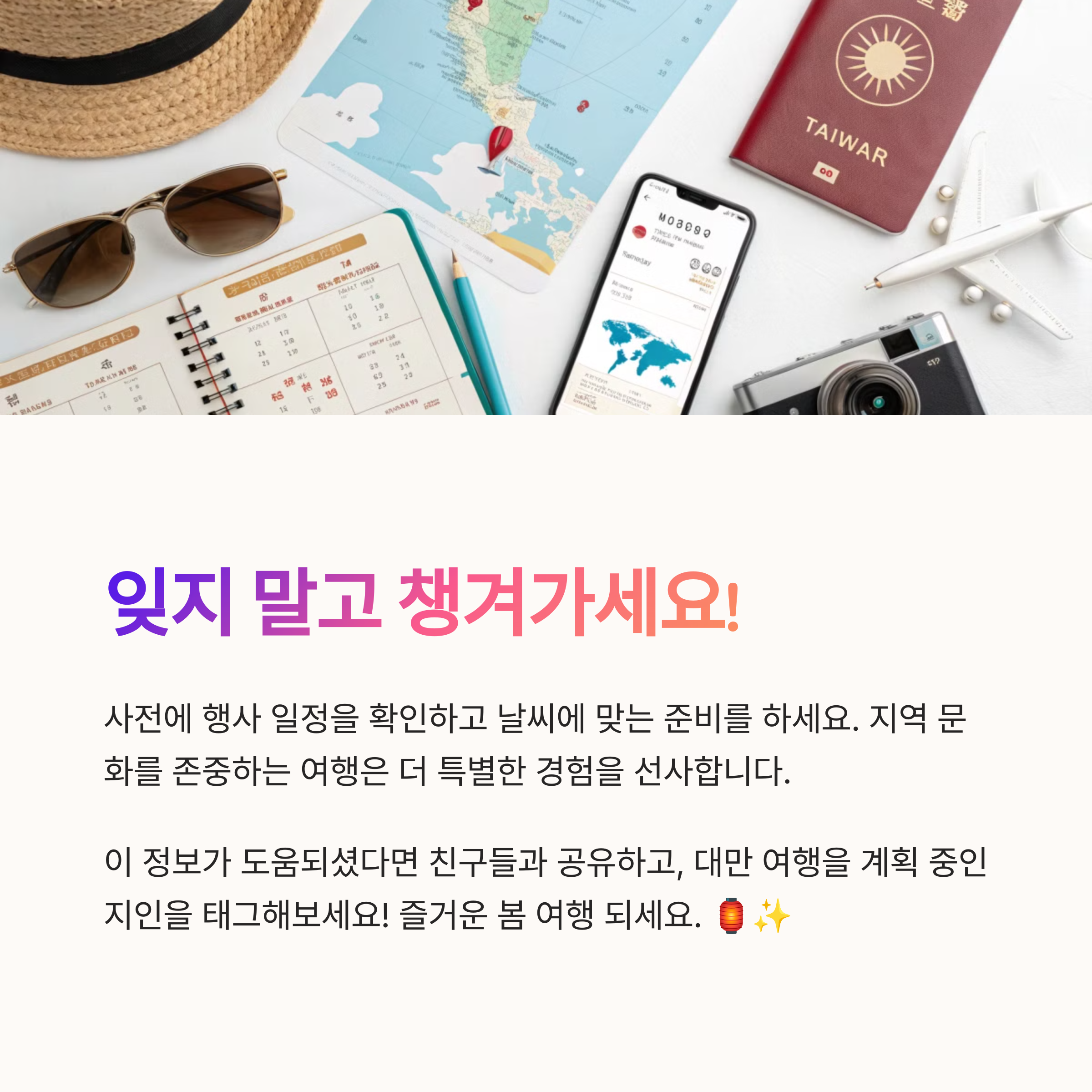 혹시 소개되지 않은 4월 대만 행사나, 여러분만의 축제 꿀팁이 있으신가요? 댓글로 공유해주시면 다른 여행자들에게도 큰 도움이 될 거예요! 마음에 드신다면 공감과 구독도 부탁드려요 :)