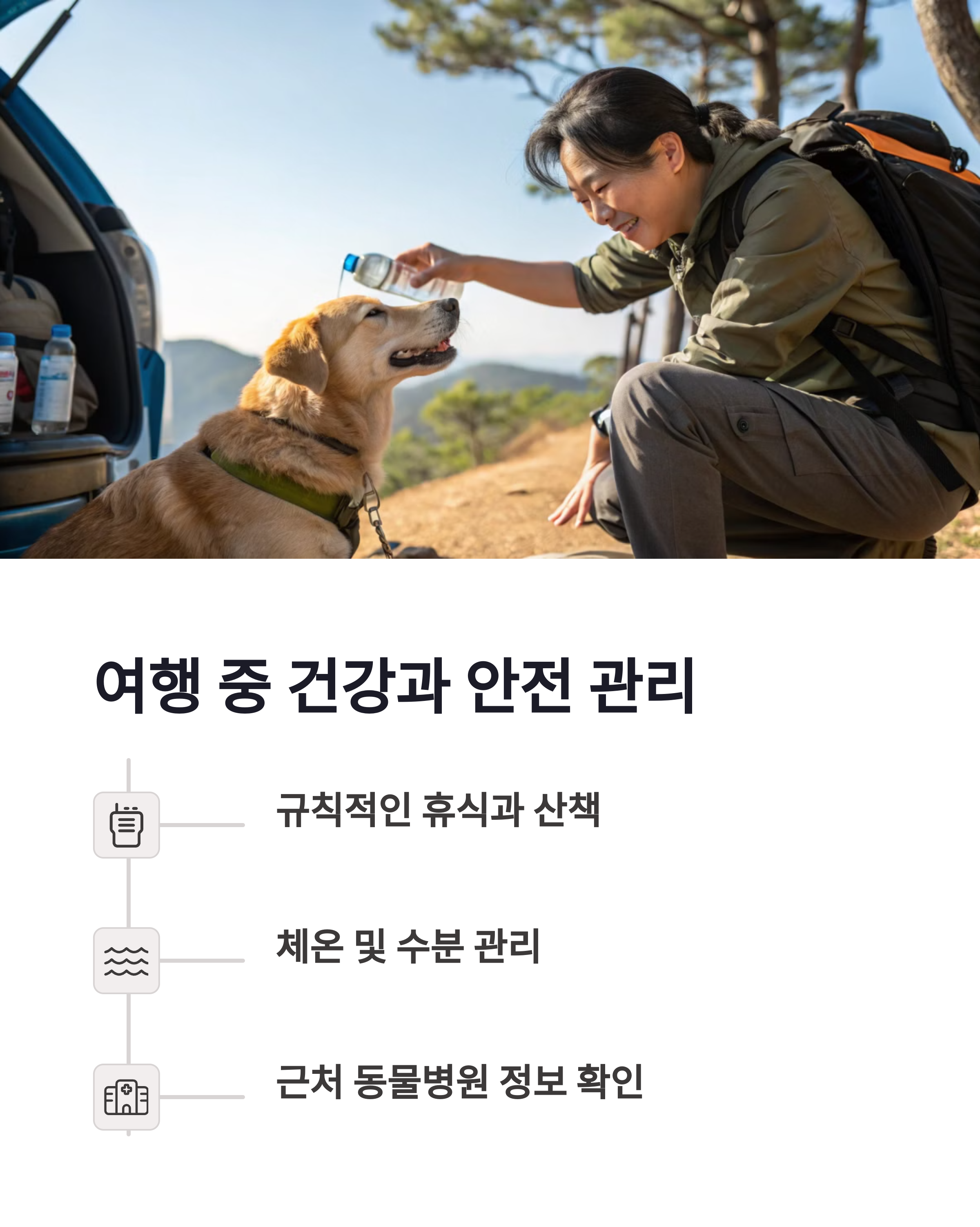 여행 중에는 반려동물 전용 응급약과 보호자 연락처가 적힌 이름표를 꼭 챙기세요. 낯선 환경에서는 작은 일에도 당황할 수 있어 평소와 다른 반응을 보일 수 있습니다. 또한 현지 동물병원 정보를 사전에 확인해두면 응급상황에도 빠르게 대처할 수 있습니다. 무엇보다 반려동물의 컨디션을 항상 체크하며 즐거운 추억만 가득한 여행이 될 수 있도록 주의 깊은 배려가 필요합니다.
