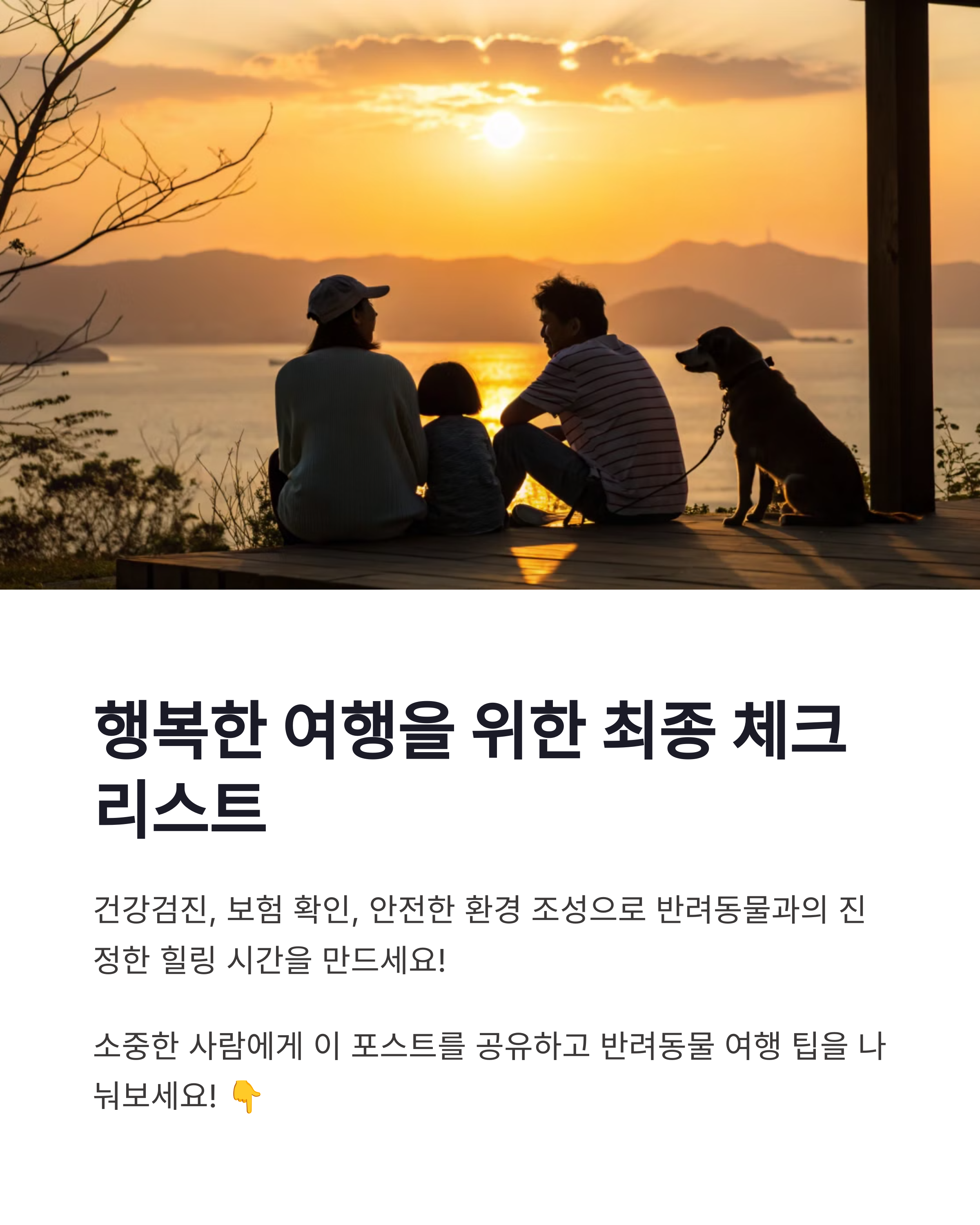 반려동물과 함께하는 여행은 단순한 외출이 아닌 가족의 새로운 추억을 만드는 소중한 시간입니다. 준비만 잘 되어 있다면 반려동물도 보호자도 모두 편안하고 즐거운 여행을 보낼 수 있습니다. 이번 콘텐츠를 통해 보다 안전하고 유익한 여행이 되길 바라며, 사랑스러운 반려동물과의 행복한 순간들이 오래도록 기억되길 기원합니다.