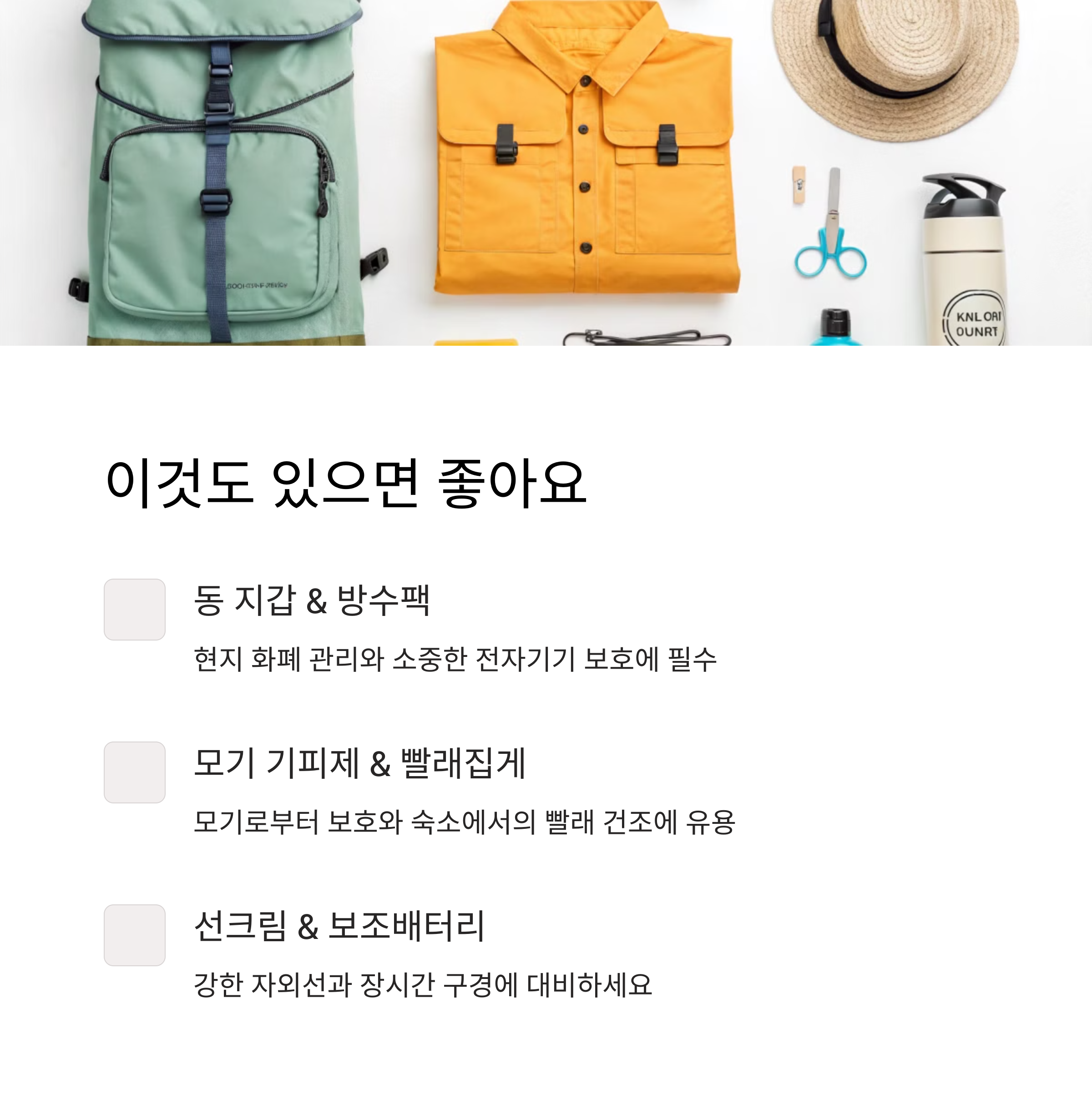 추가 준비물은 여행 중 유용하게 쓰입니다.