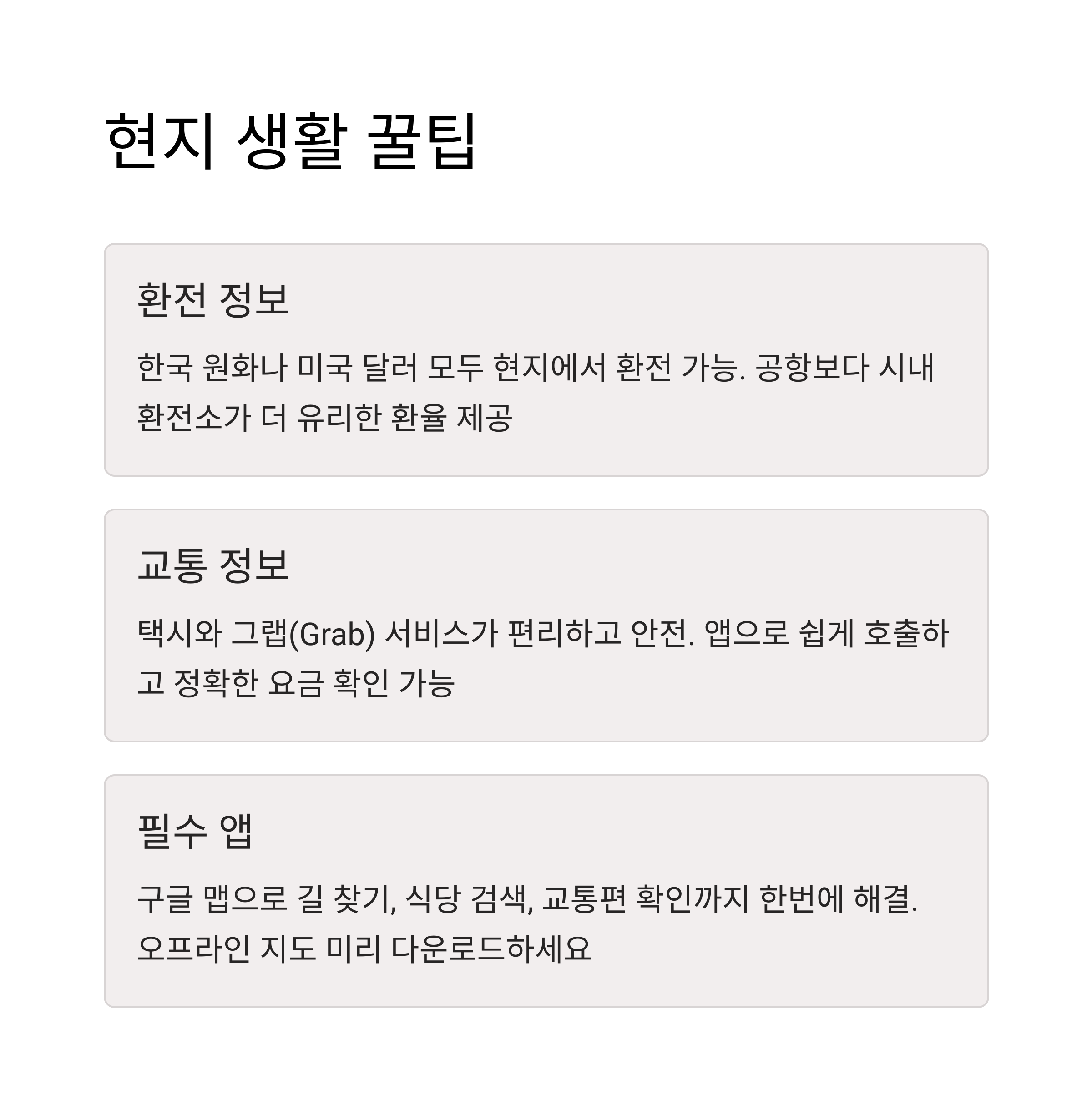 | 여권 | 유효한 여권이 필요하며, 비자 여부는 사전 확인 필수입니다. |