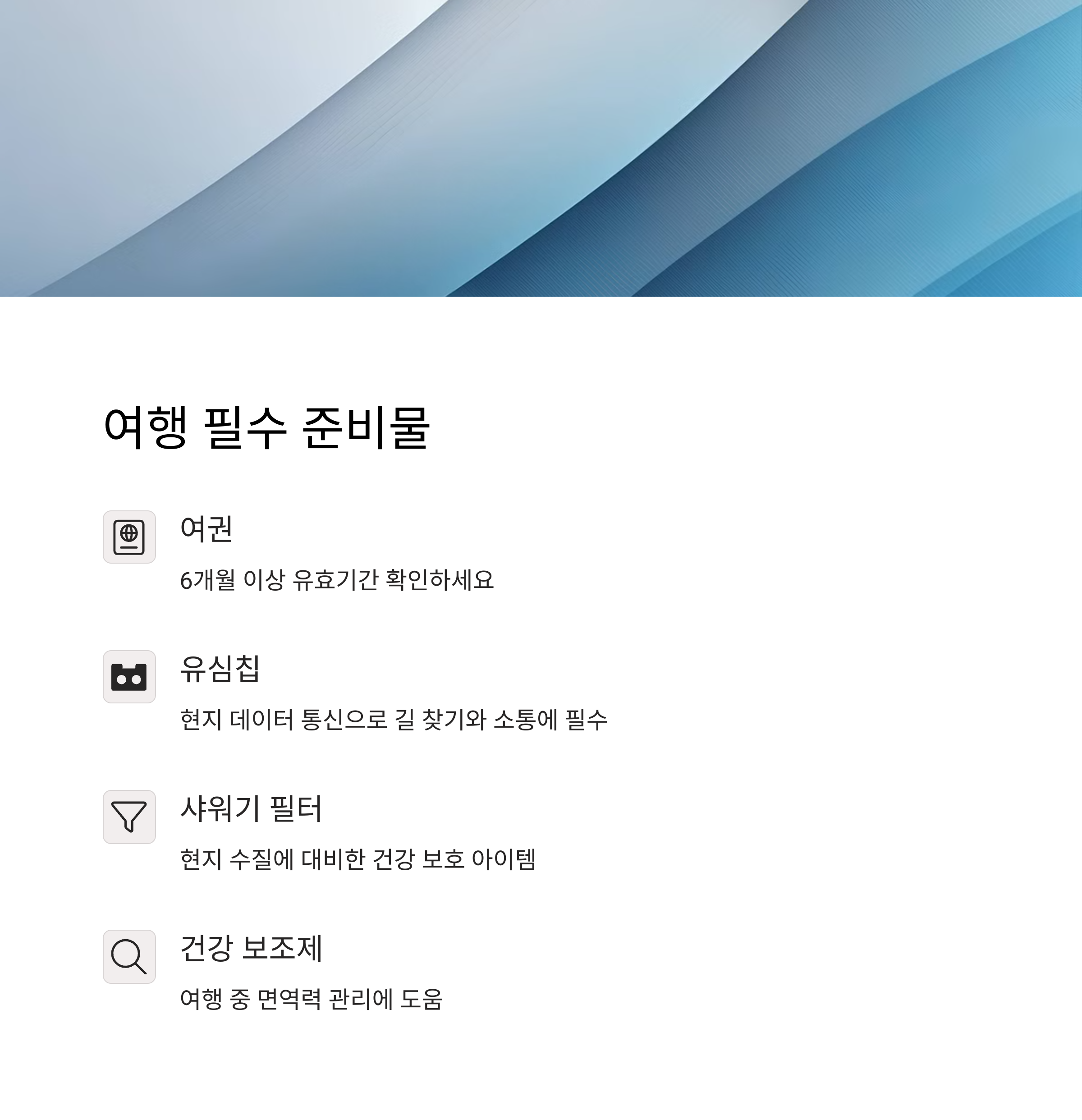 여행 준비물의 철저한 점검이 있어야만 안전하고 즐거운 여행을 누릴 수 있습니다.