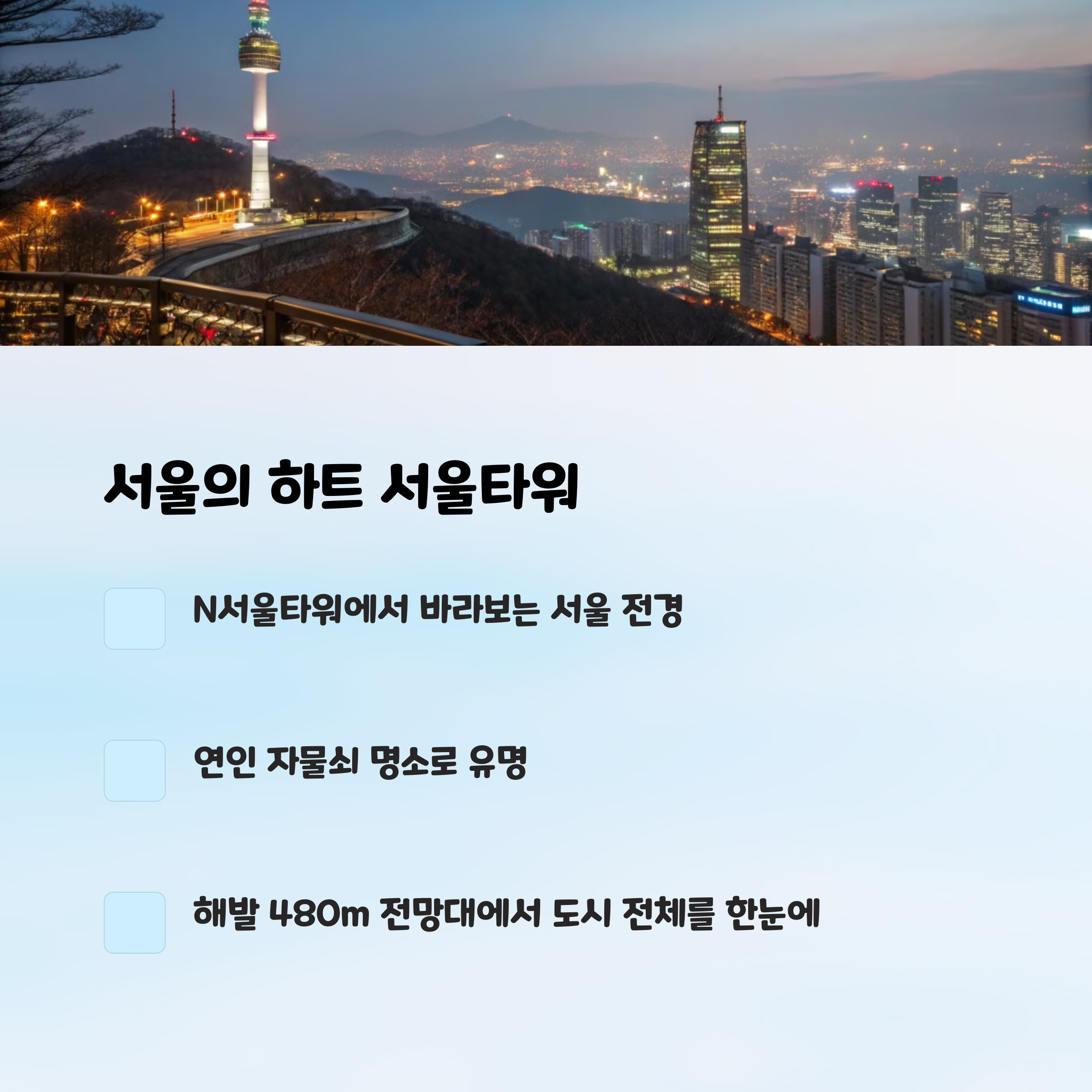| 다양한 각도에서 즐기는 조명과 불빛 | 낮과 밤이 다른 매력을 지닌 여행지 | 야경 속 감성적인 분위기 연출 |