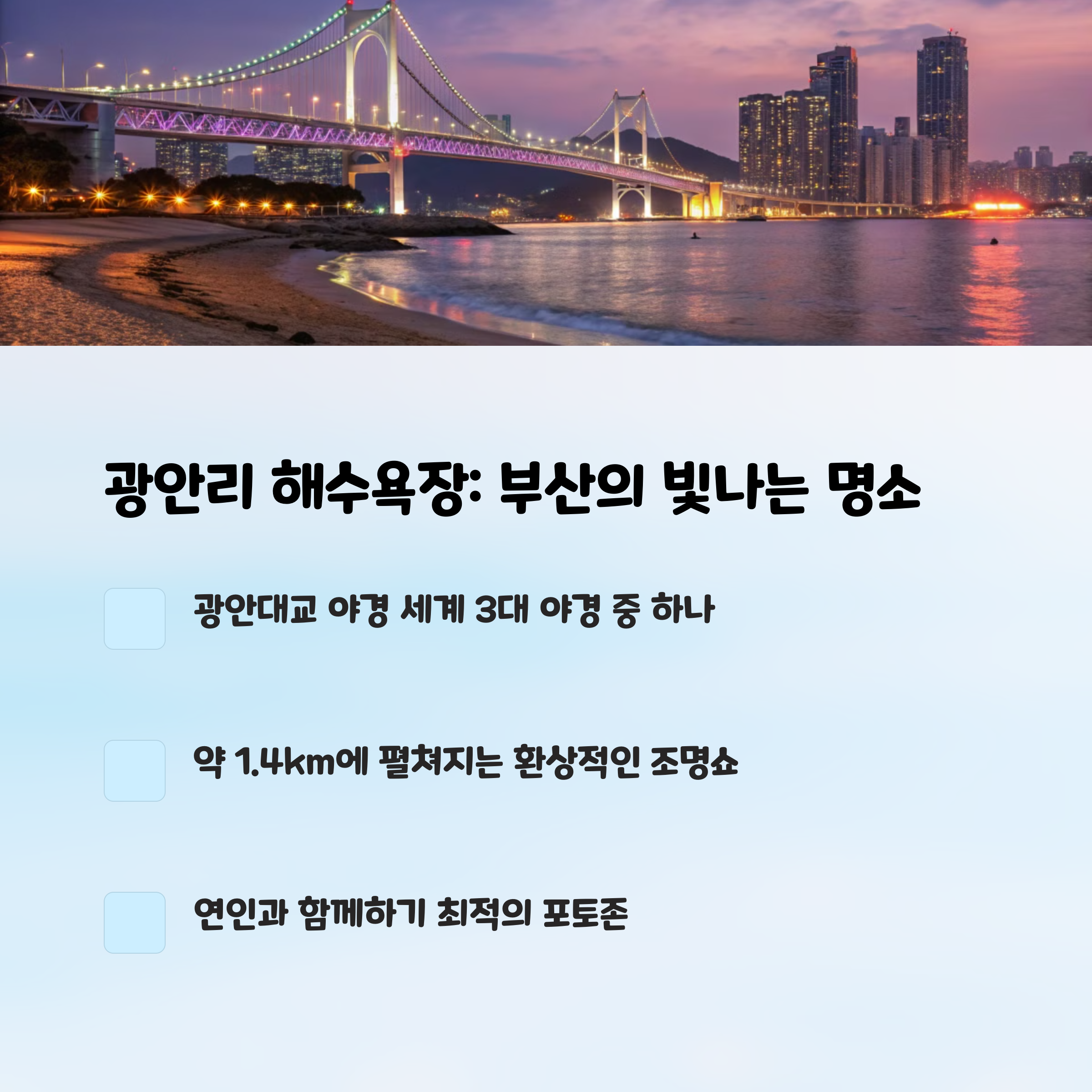 | 광안리, 남산타워, 안동 월영교 등 유명 야경 스팟 | 봄에 가기 좋은 감성 가득한 국내 장소 소개 | 사랑하는 사람과 떠나기 좋은 야경 명소 |