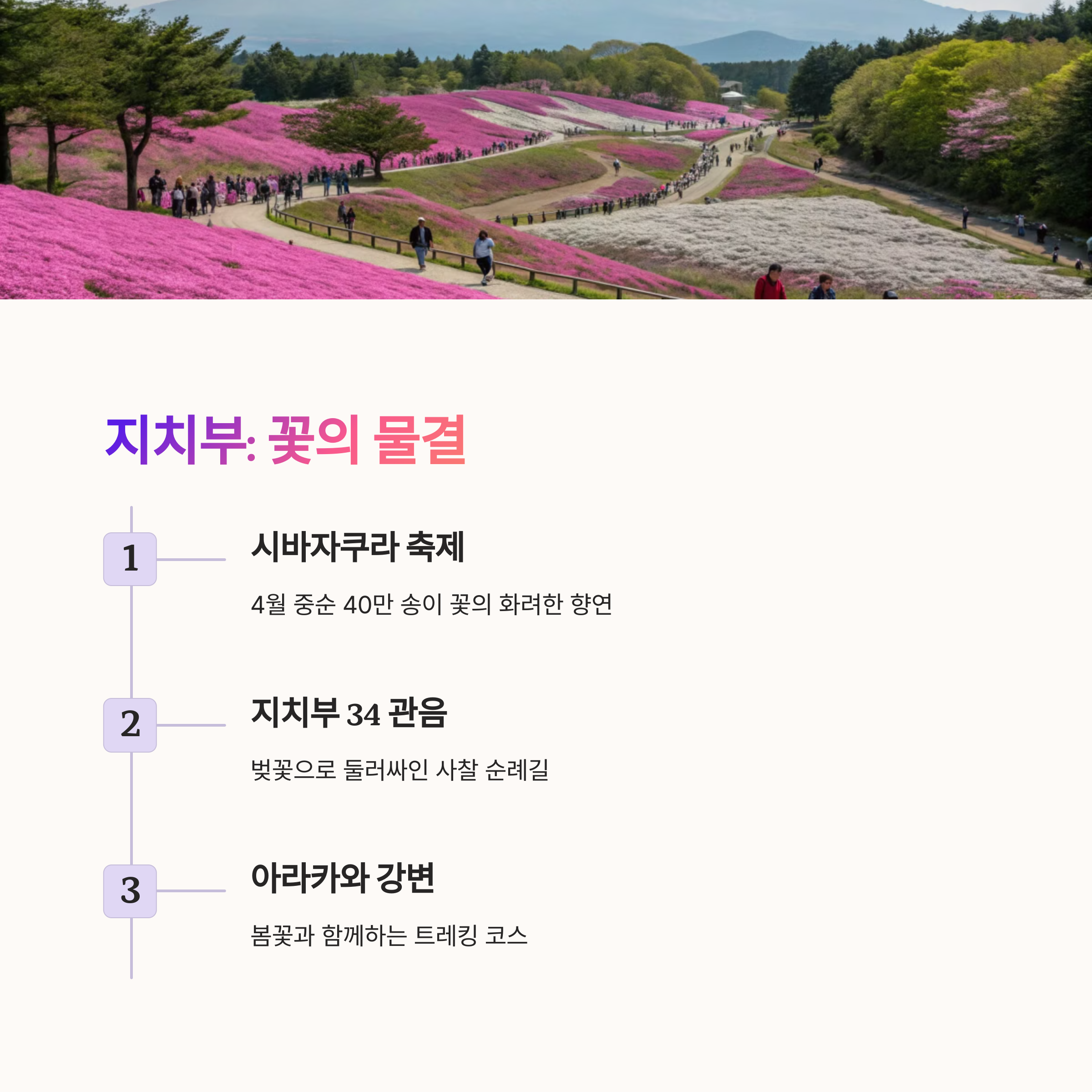 지치부는 도쿄에서 북서쪽으로 약 2시간 거리의 지역으로, 자연과 전통문화가 살아있는 조용한 마을입니다. 봄이 되면 시바자쿠라(잔디 벚꽃) 축제가 열려 분홍색 꽃으로 물든 언덕에서 잊지 못할 풍경을 만날 수 있습니다. 관광객이 많지 않아 여유롭게 사진도 찍고 힐링할 수 있는 곳으로, 일본의 또 다른 매력을 발견할 수 있는 숨은 여행지입니다.