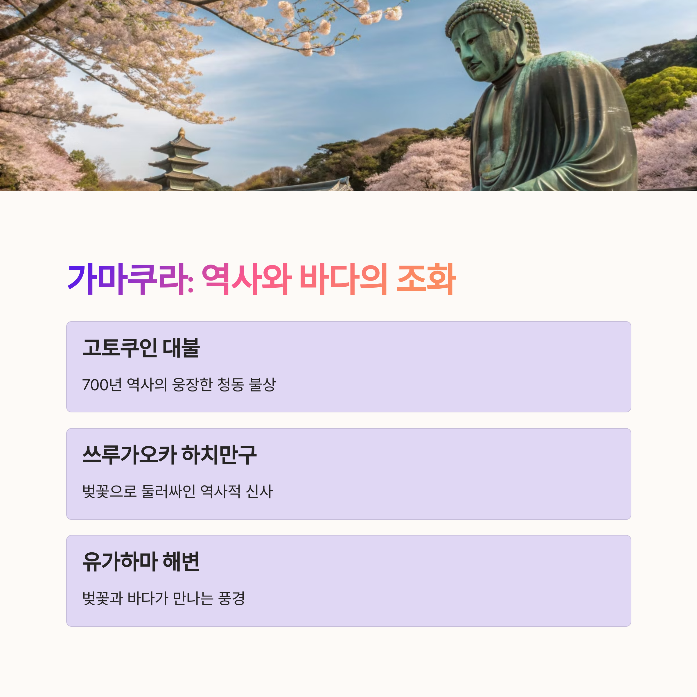 봄이라는 계절은 우리에게 특별한 감성을 선사합니다. 일본의 소도시는 그 감성을 더욱 풍부하게 해주는 보석 같은 공간들입니다. 도쿄에서 멀지 않은 곳에 위치한 가마쿠라, 지치부, 에노시마는 각각의 매력을 품고 있으며, 여행자들에게 잊지 못할 추억을 남겨줍니다. 번화한 도심과는 또 다른, 조용하면서도 깊이 있는 일본의 분위기를 원하신다면 꼭 한번 방문해보시기를 추천드립니다. 바쁜 일상 속 숨통을 틔우고, 봄꽃과 자연을 만끽하며 진정한 휴식을 누릴 수 있는 여행이 되시길 바랍니다.