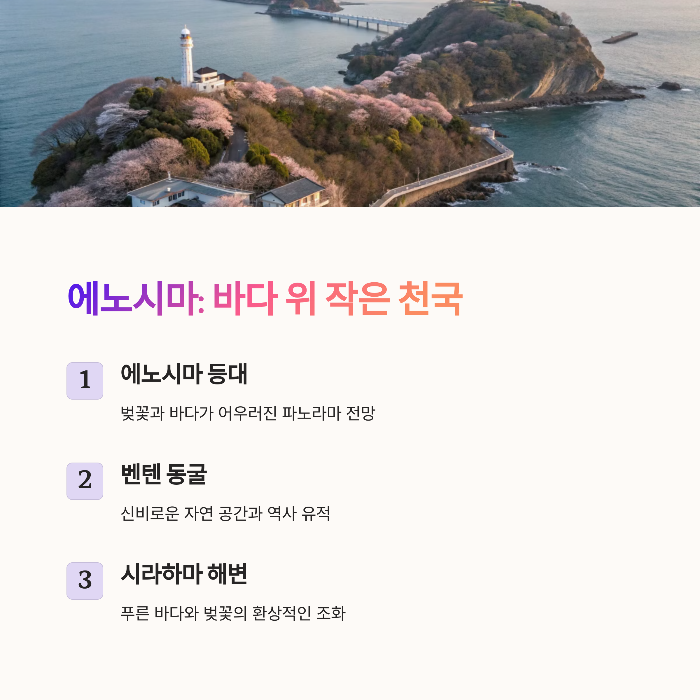 | 벚꽃과 바다, 사찰이 어우러진 감성 도시 | 시바자쿠라 축제로 유명한 힐링 여행지 | 도쿄 근교의 작은 섬과 전망대, 힐링 포인트 |