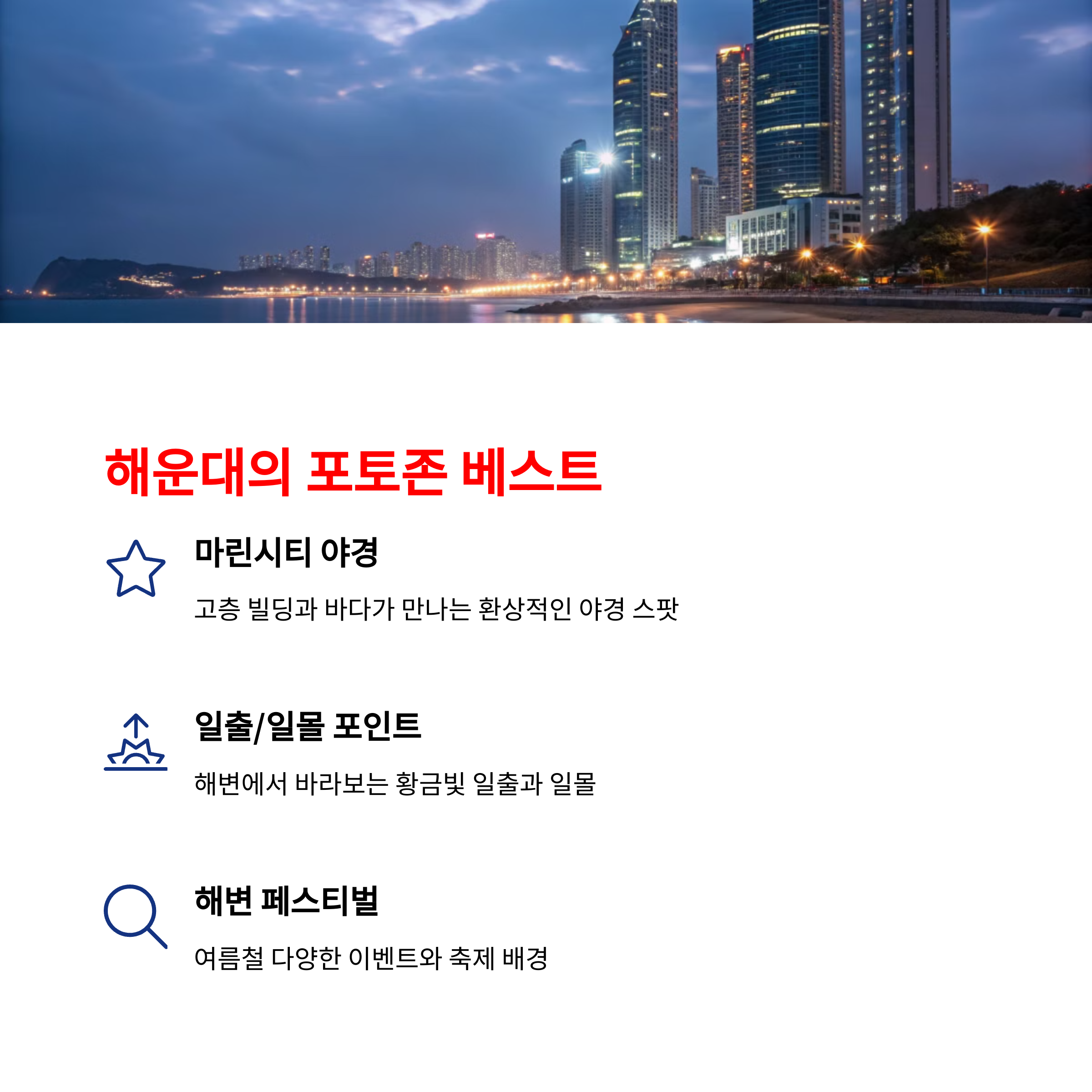 부산의 대표적인 두 해변, 해운대와 광안리는 각각 다른 매력으로 여행객의 마음을 사로잡고 있습니다. 한쪽은 넓고 활기찬 분위기로, 다른 한쪽은 조용하고 감성적인 밤의 풍경으로 추억을 선물하죠. 본인의 여행 목적과 감성에 따라 더 잘 맞는 해변을 선택하는 것이 가장 중요합니다. 사진을 통해 추억을 남기고 싶다면 배경, 분위기, 시간대 등도 함께 고려해보세요. 무엇보다 중요한 건 여행지에서 마음껏 즐기고 웃을 수 있는 순간들이겠죠. 여러분의 부산 여행이 멋진 인생샷과 함께 아름답게 기록되길 바랍니다!