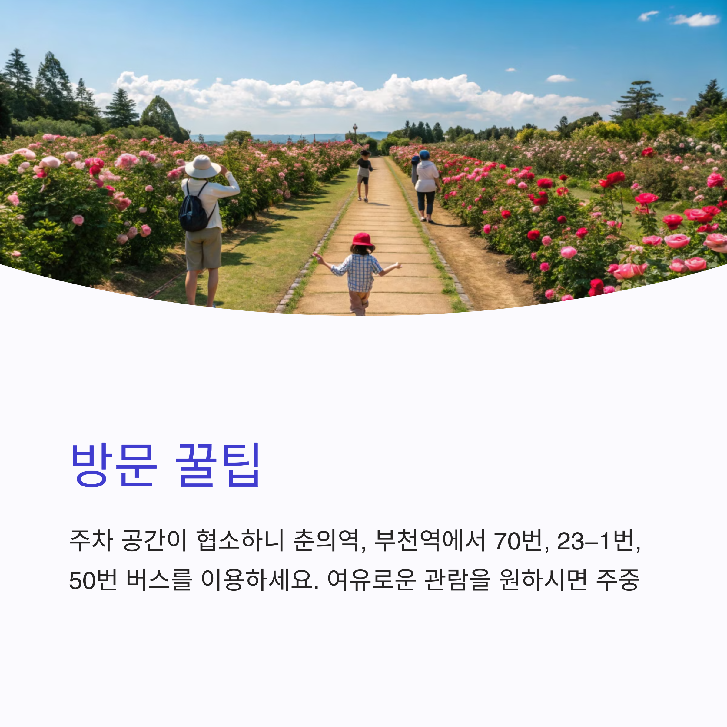 부천 백만송이장미원을 방문하시기 위한 좋은 팁은 대중교통을 이용하는 것이다.
