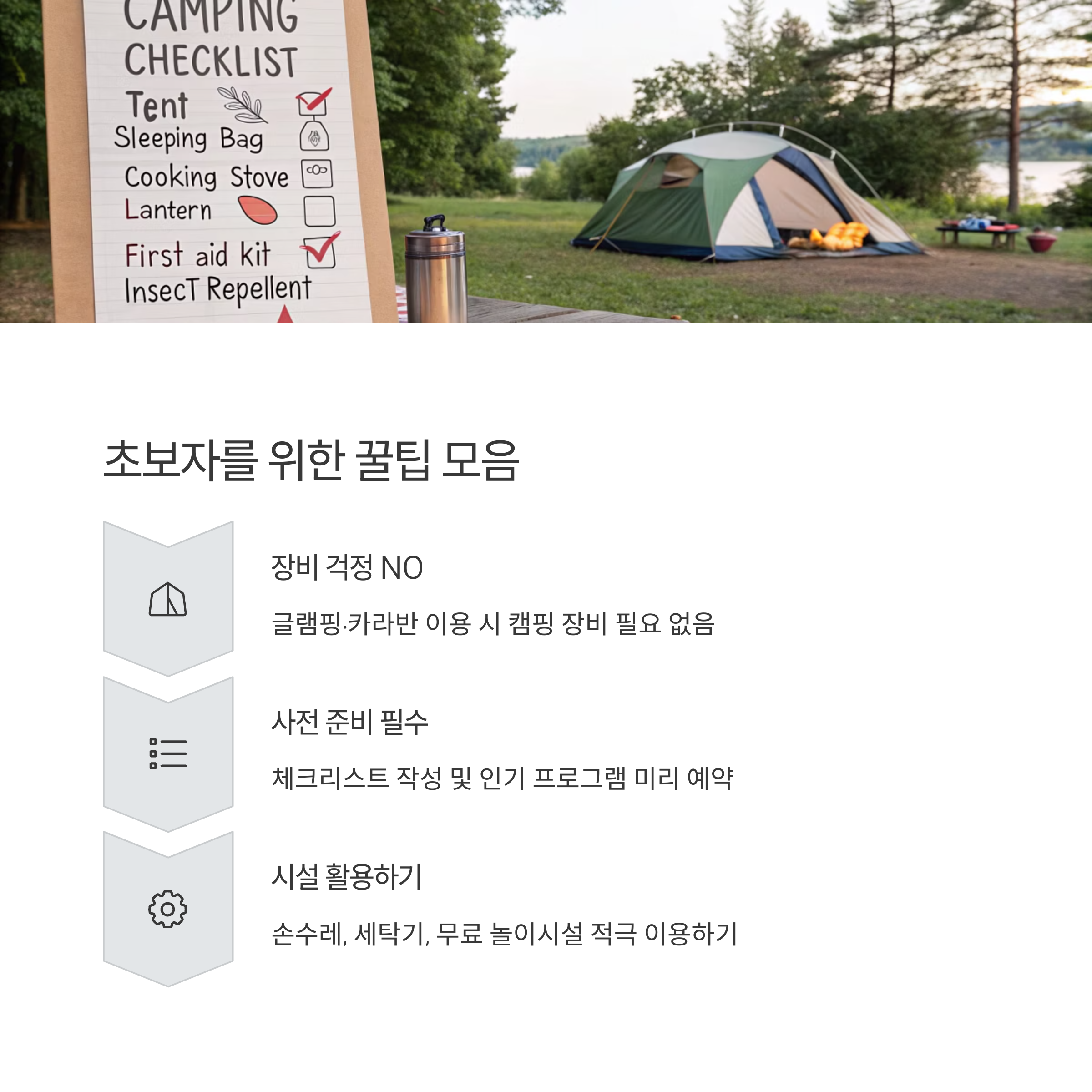 둘째, 캠핑 초보라면 체크리스트를 만들어 필요한 짐을 챙기면 더 여유롭습니다