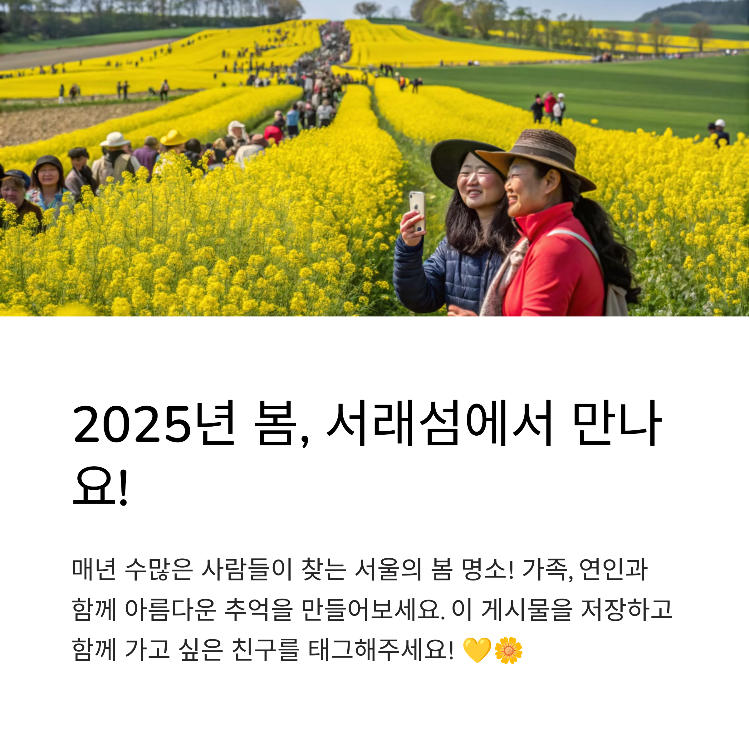놓치지 말고 서래섬 유채꽃축제에 참석하십시오!