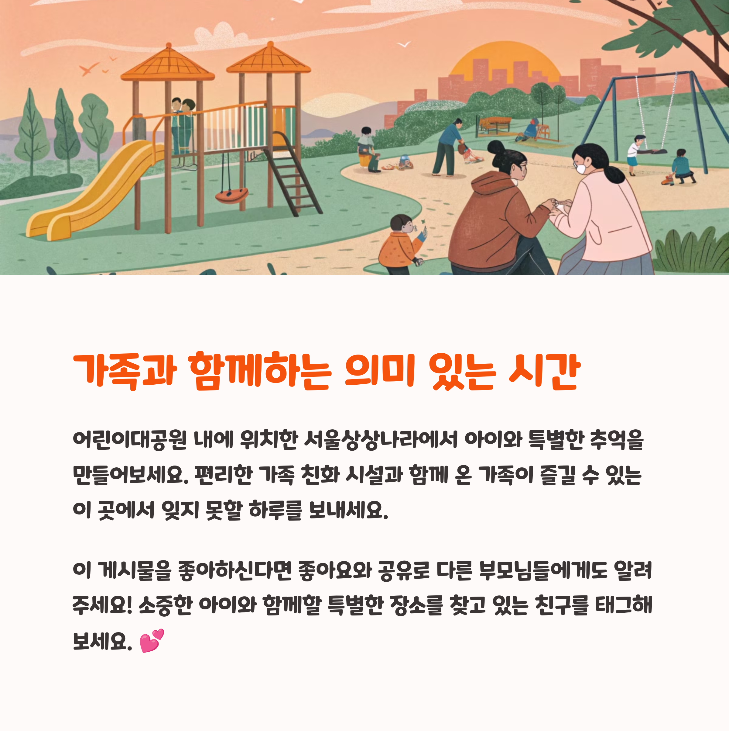 혹시 서울상상나라를 다녀오신 적이 있으신가요? 아이와 함께한 체험 중 기억에 남는 공간이나 유익했던 활동이 있다면 댓글로 공유해 주세요. 여러분의 이야기가 많은 가족들에게 큰 도움이 될 거예요!