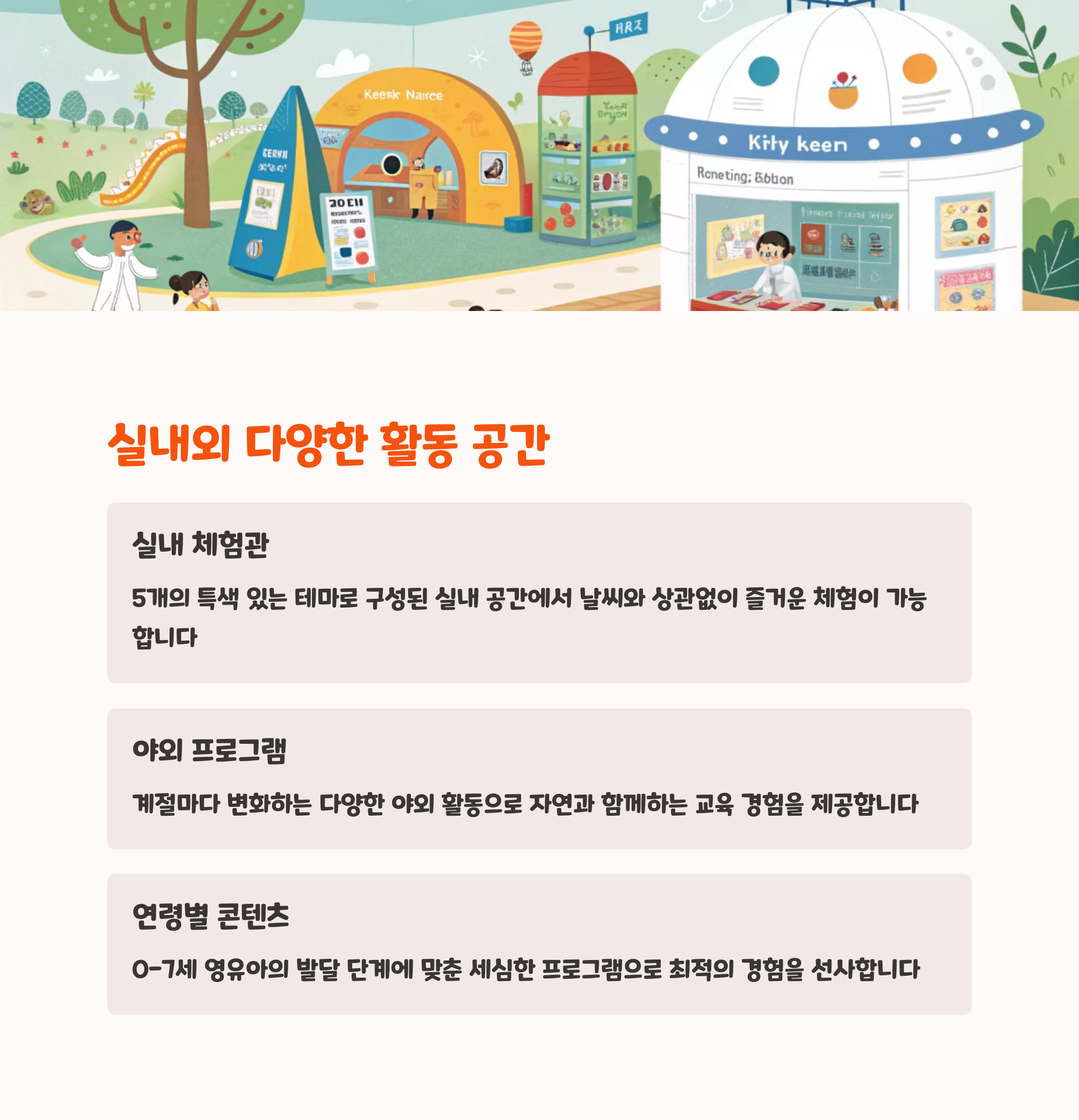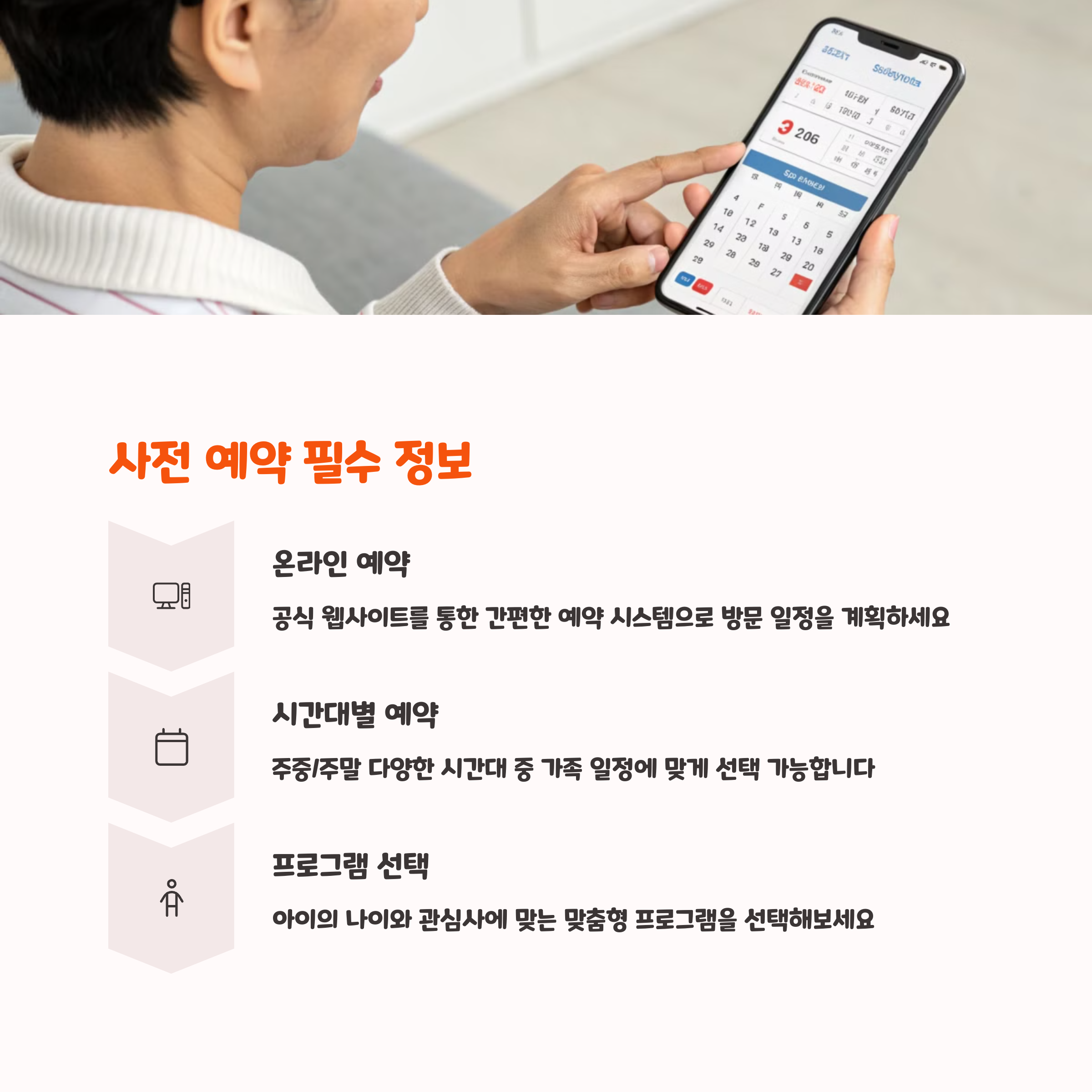 | 촉각, 시각, 청각 등 다양한 감각을 자극하는 활동 | 어린이대공원 내에 위치해 접근성 우수 | 홈페이지 통해 시간대별 예약 가능 |
