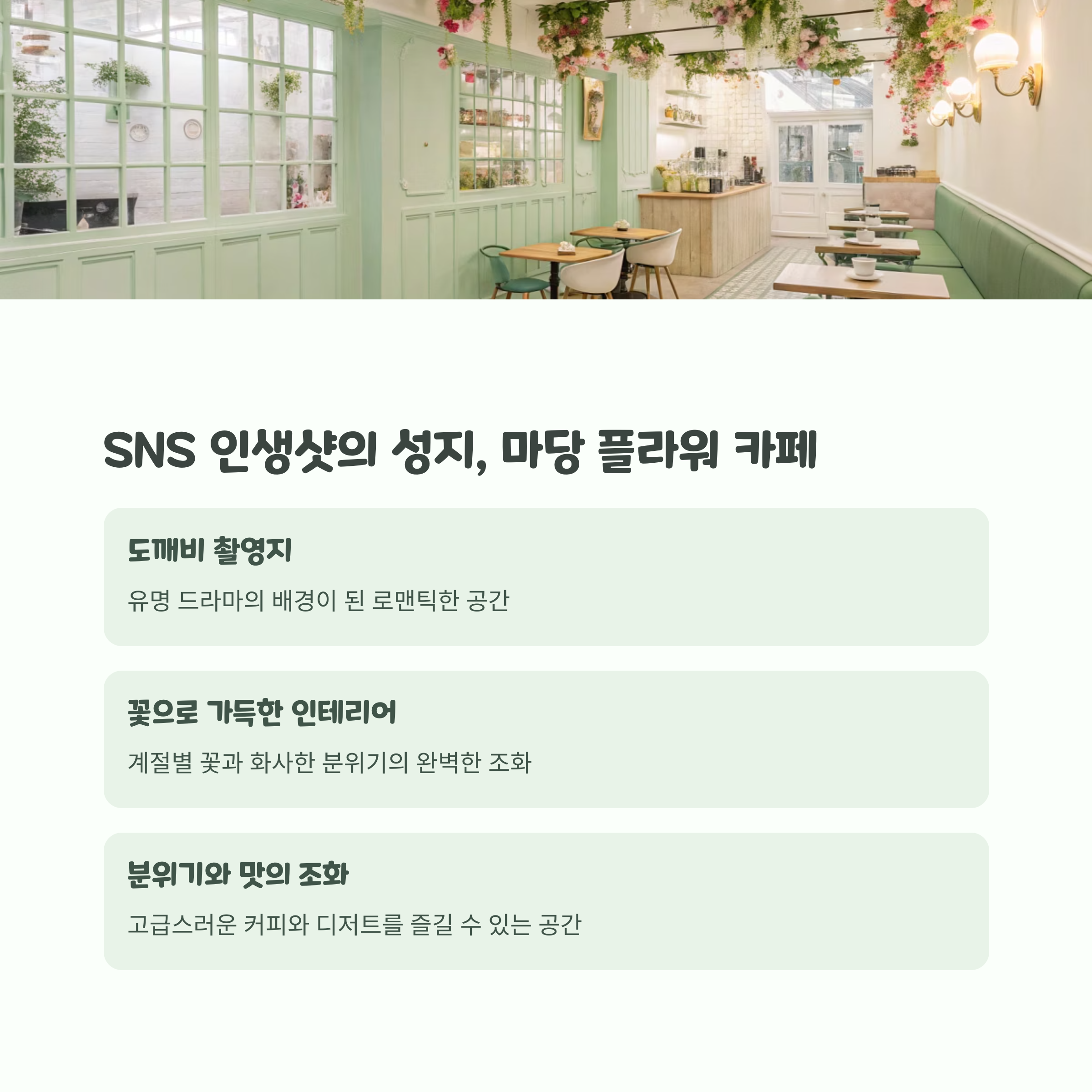 특히, 드라마 '도깨비' 촬영지로 유명한 마당 플라워 카페는 많은 이들의 발길을 사로잡고 있습니다.
