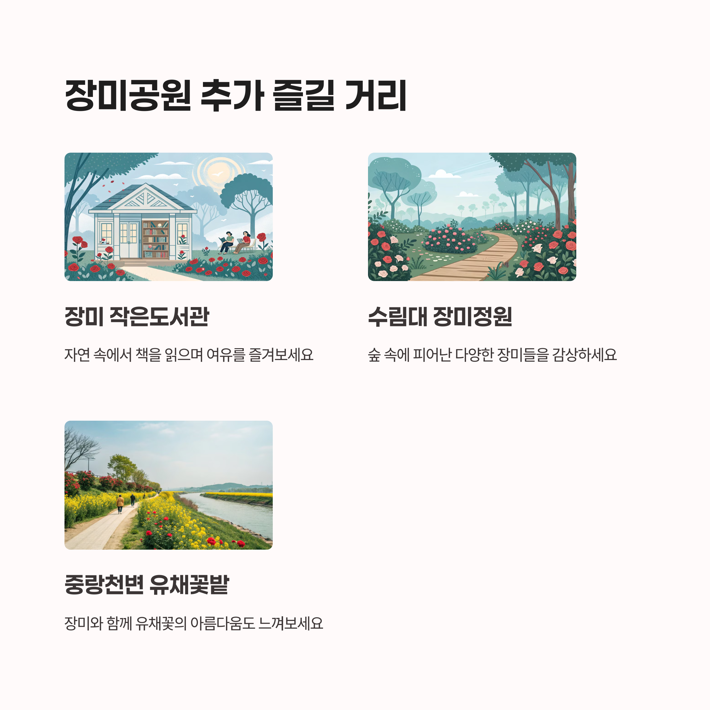 중랑장미공원에 다녀오신 분들! 언제가 가장 예뻤는지, 어떤 프로그램이 좋았는지 댓글로 알려주세요. 방문을 고민 중인 분들에게도 큰 도움이 될 거예요!