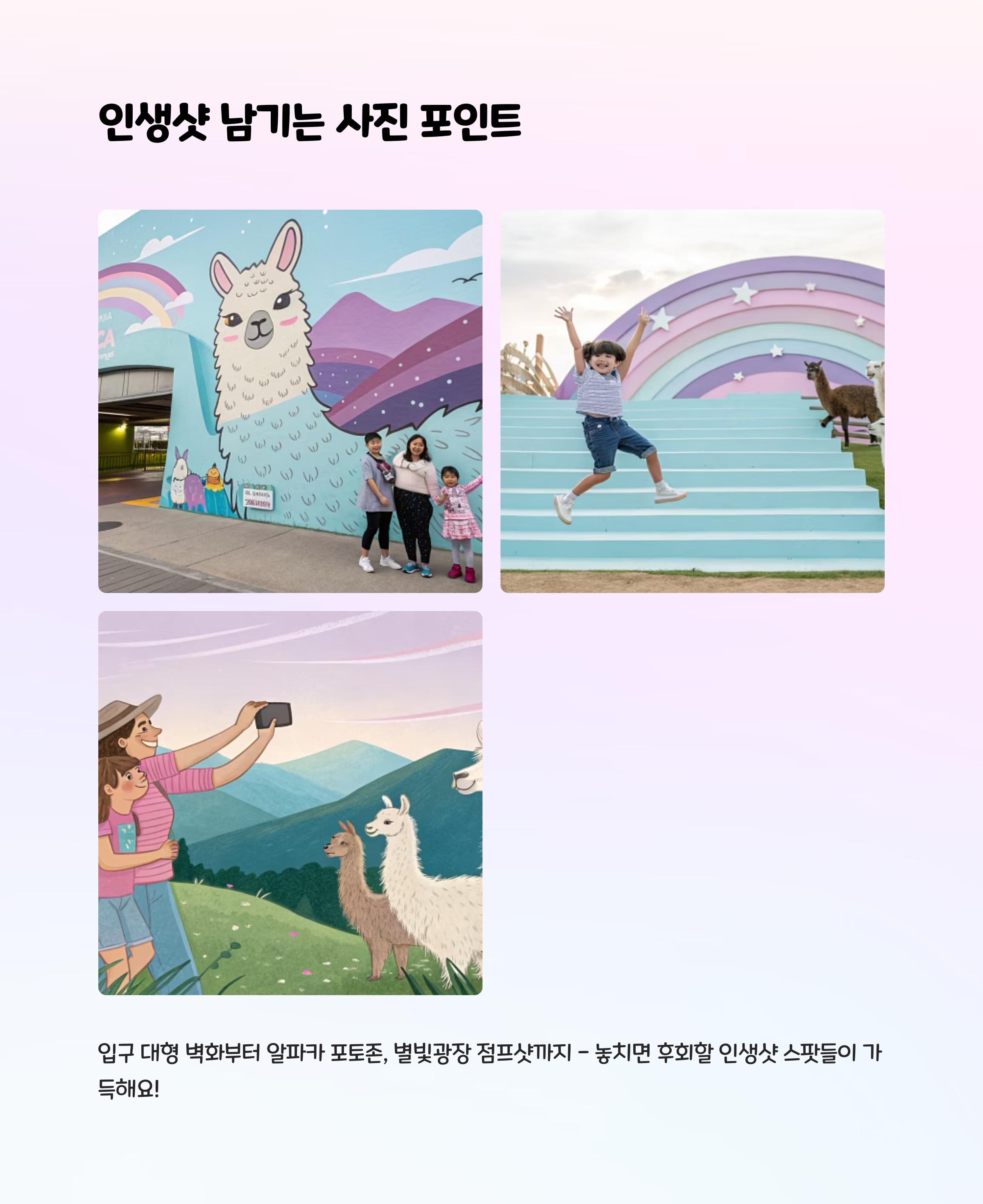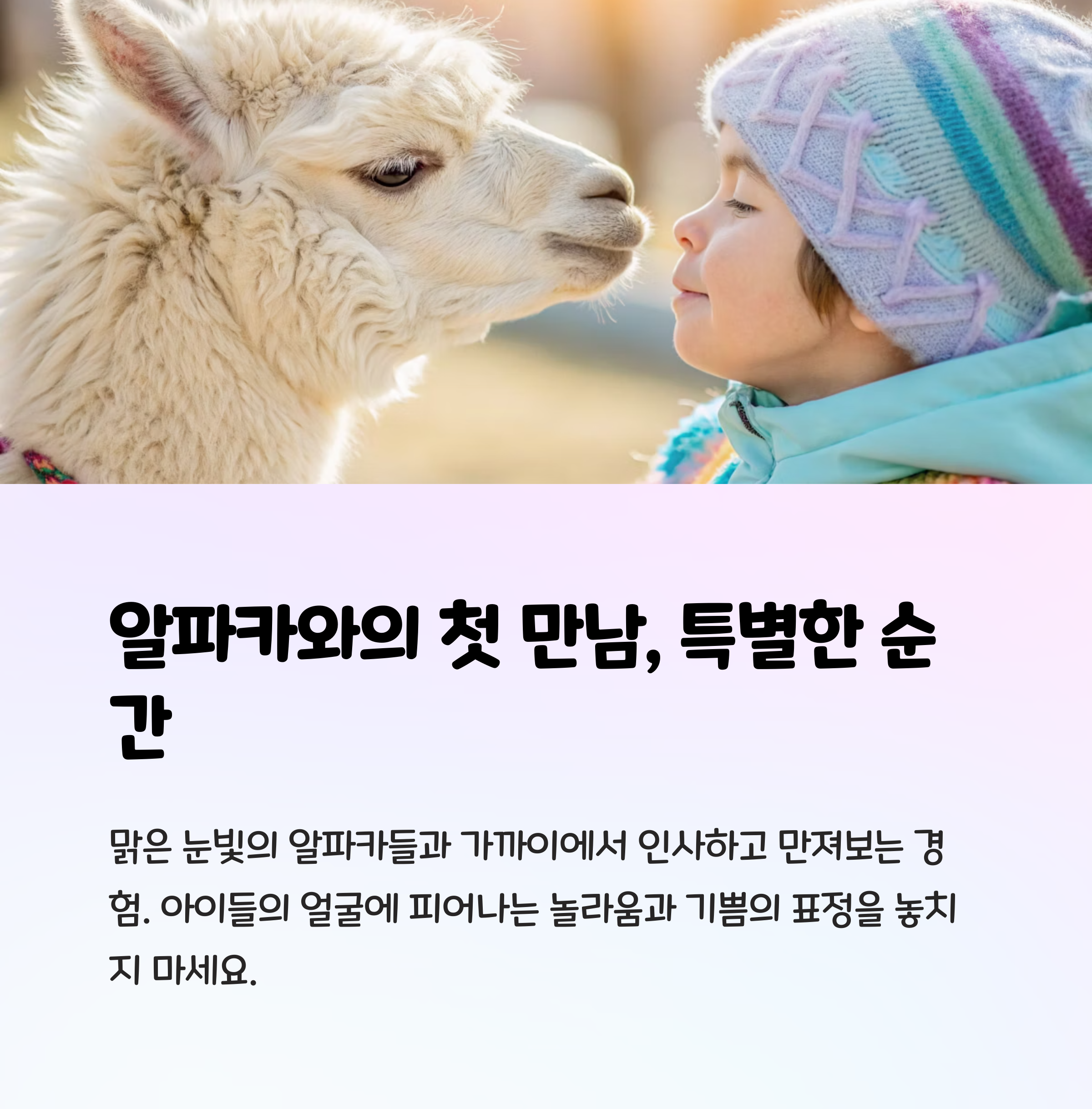 특히 알파카와 아이가 함께 있는 모습은 두고두고 꺼내보고 싶은 소중한 장면이 됩니다