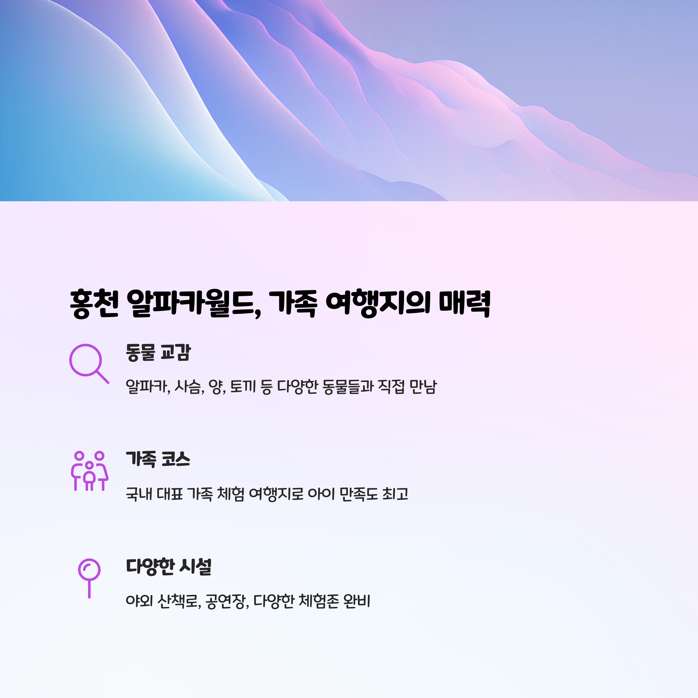 홍천 알파카월드는 강원도 홍천의 깨끗한 자연 속에서 알파카와 다양한 동물을 가까이 만날 수 있는 테마파크입니다