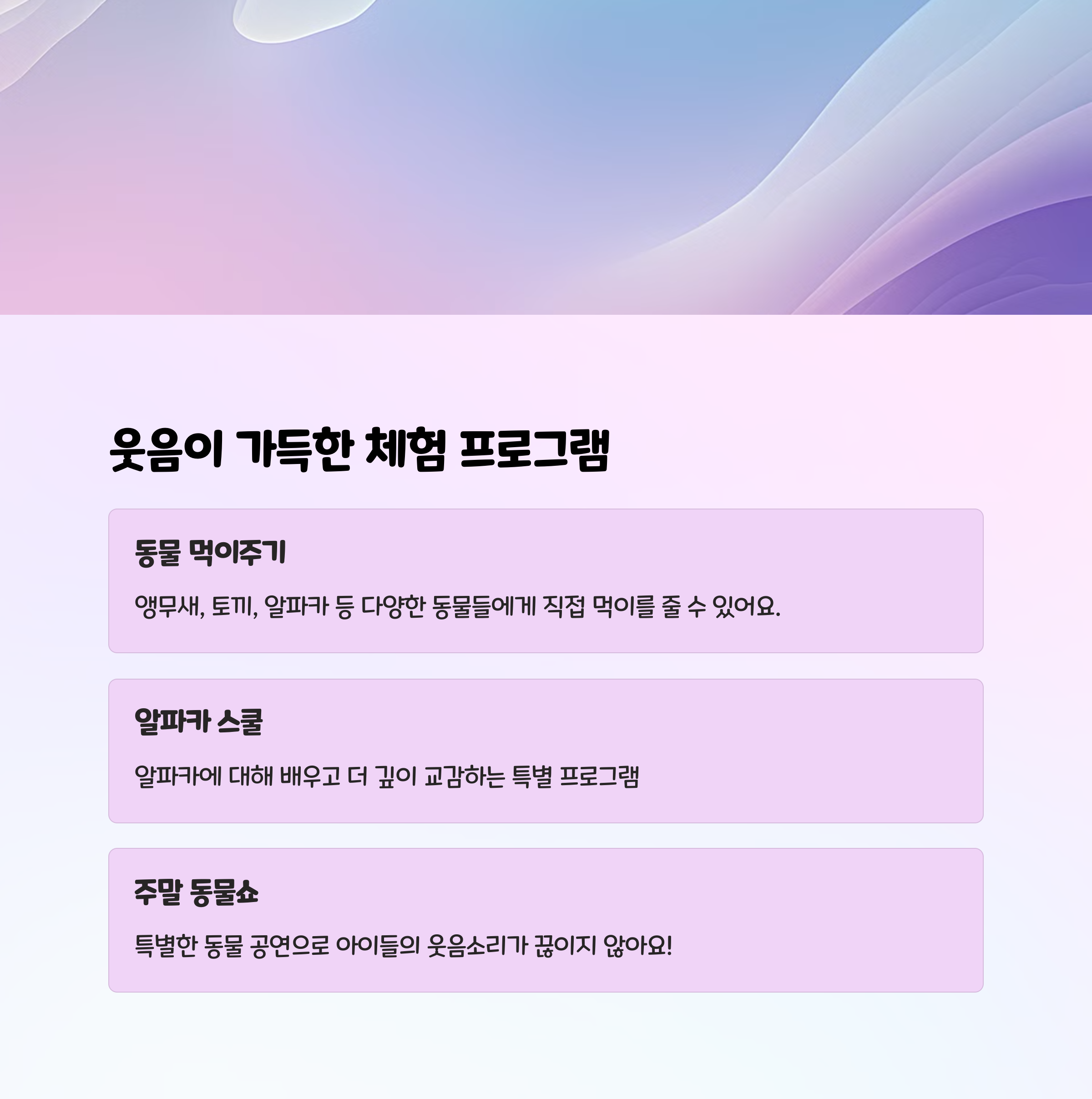동물 먹이주기, 포니 타기, 양떼 체험 등 아이들이 자연스럽게 동물과 친해질 수 있는 시간이 많아요