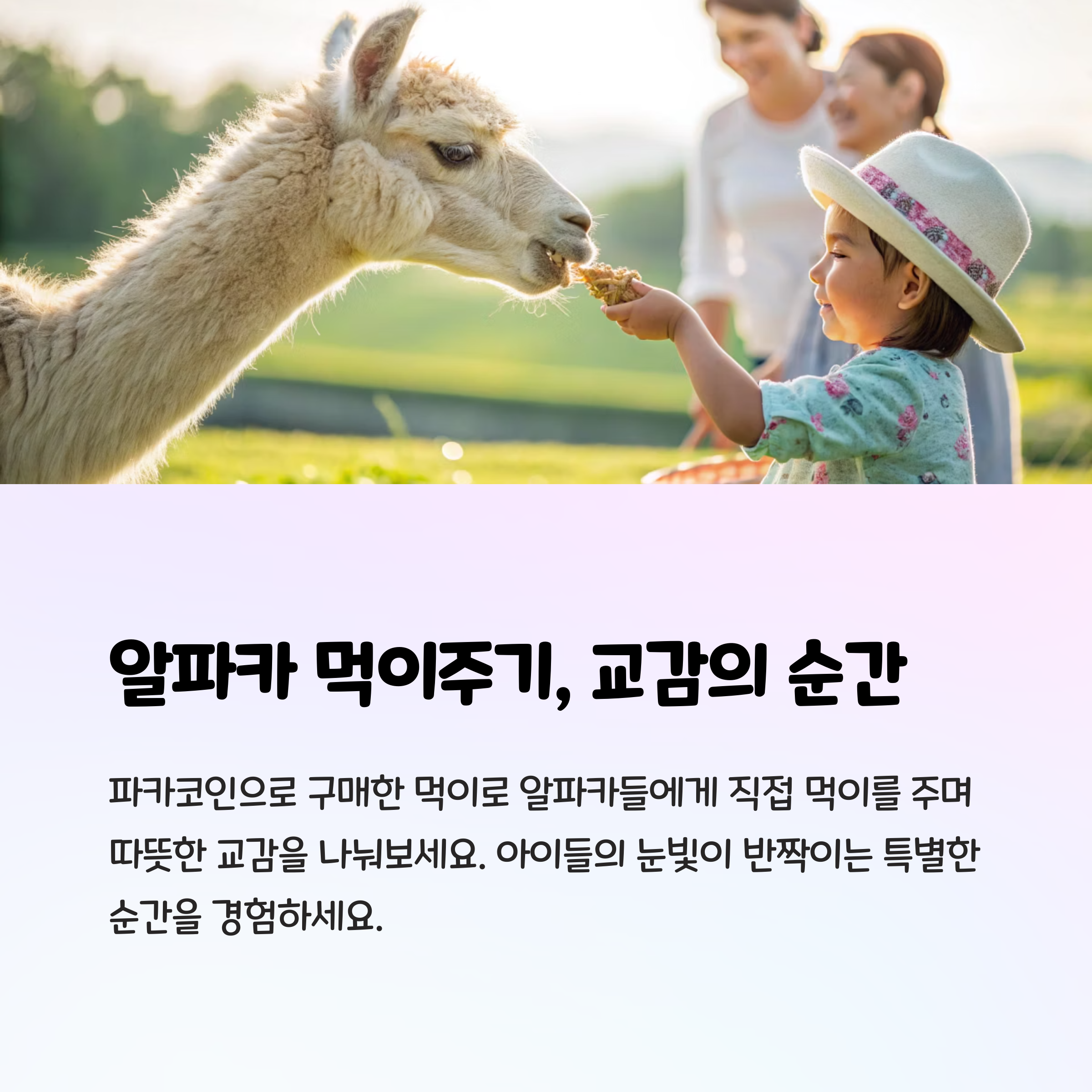 알파카에게 직접 먹이를 주는 체험은 아이뿐만 아니라 어른에게도 특별한 기억이 됩니다