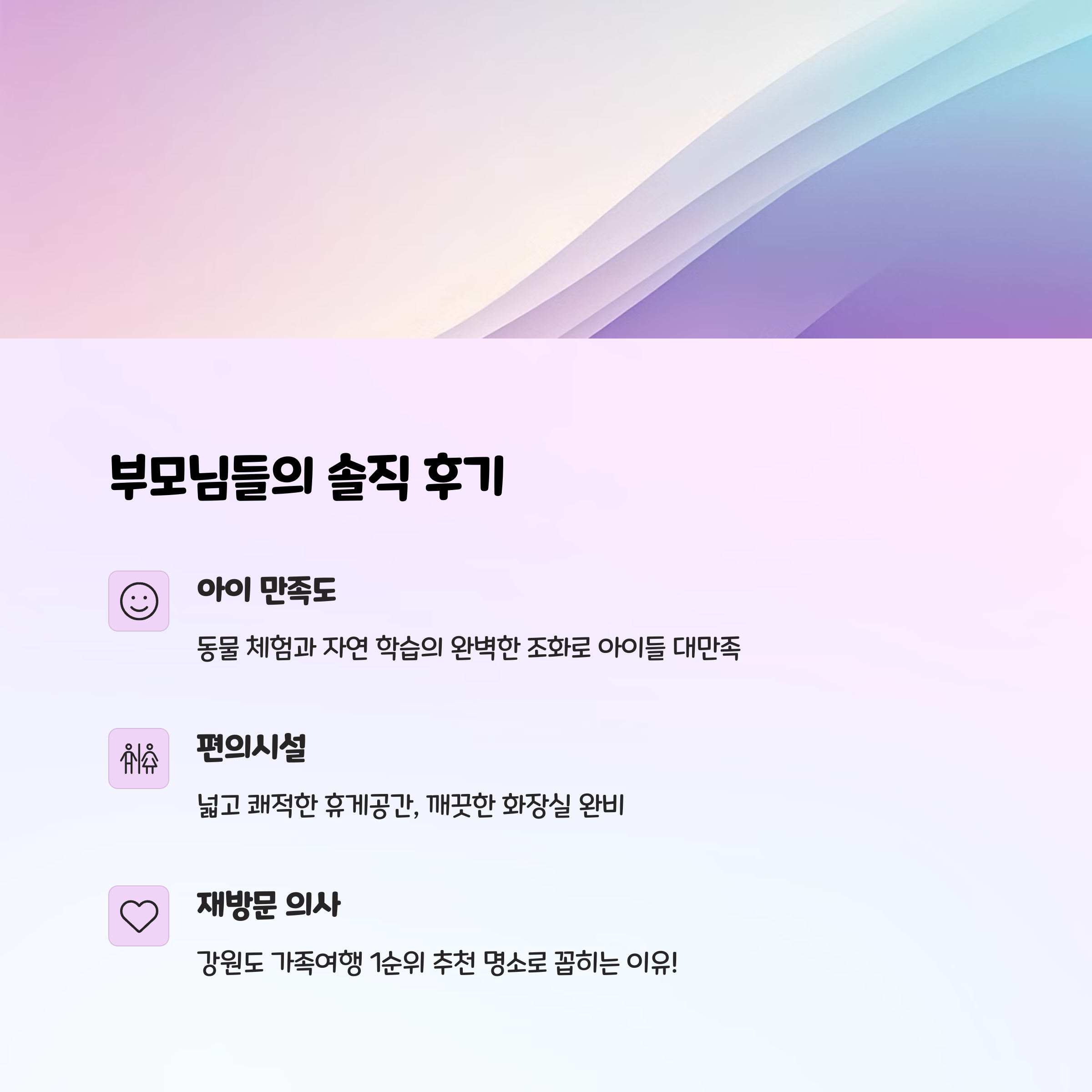 여행 후기를 보면 "부모도 아이만큼 만족스러운 힐링의 시간을 보냈다"는 의견이 많아요