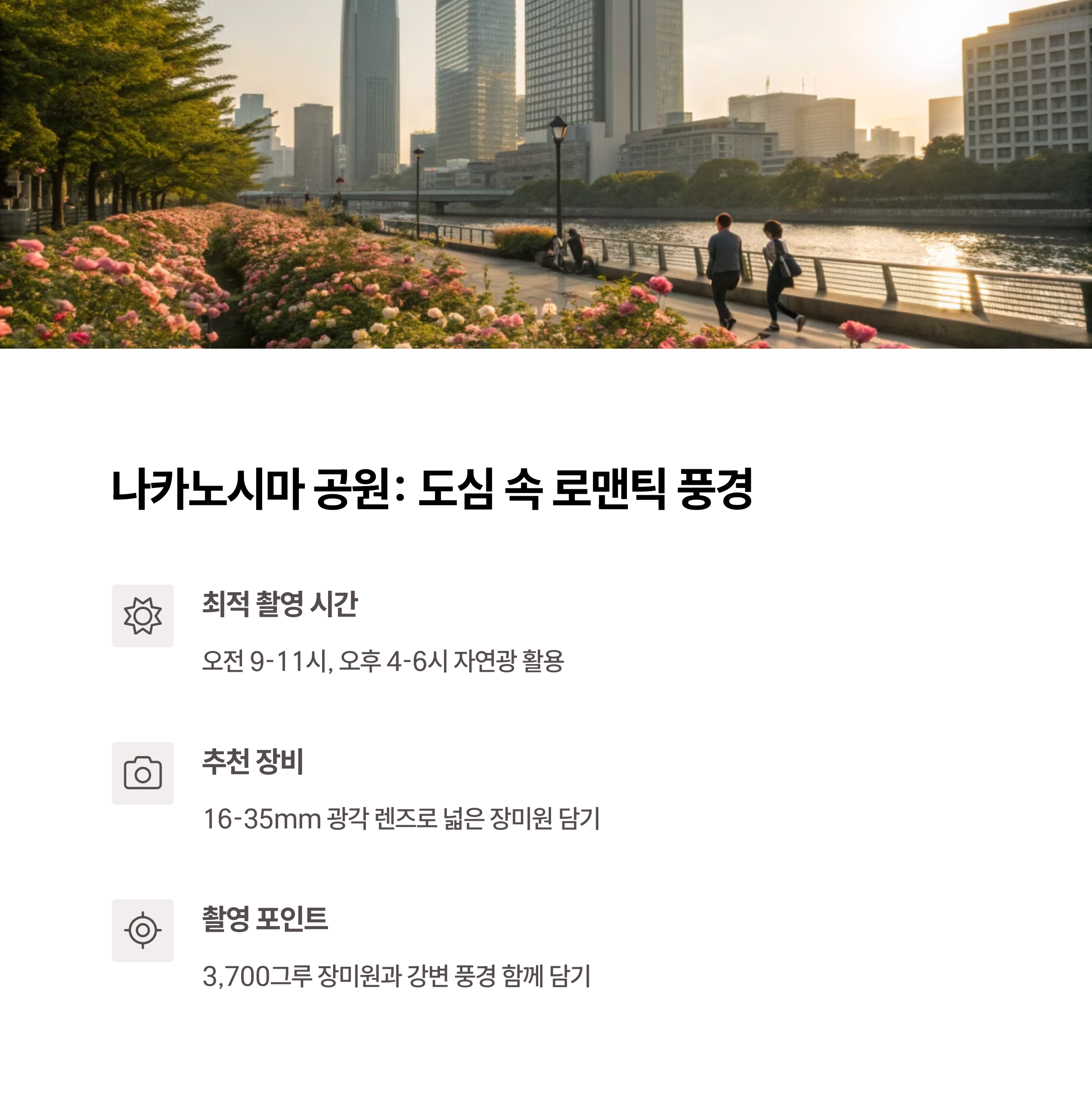 촬영 장비 팁도 함께 제공 | 거리감과 배경 조화 중점 | 자연광 활용 방법 안내 |