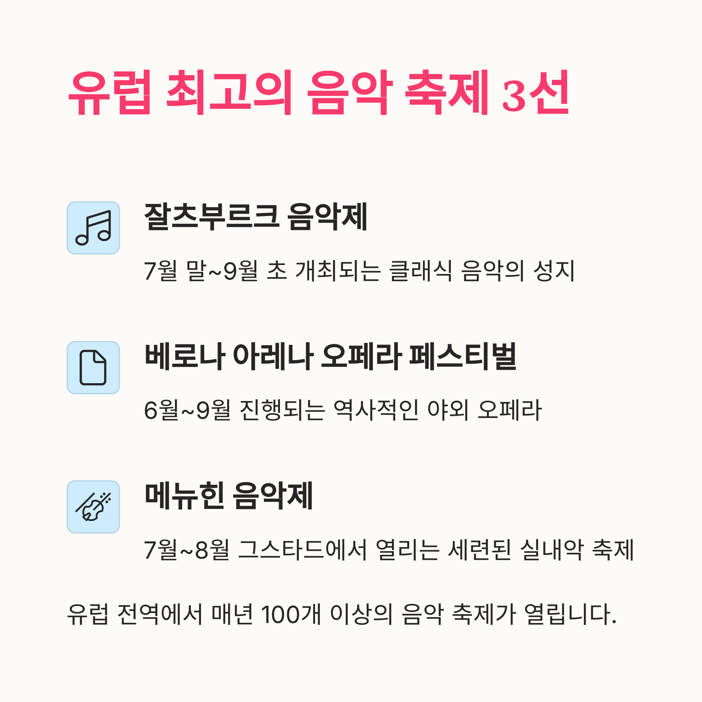 유럽 음악 축제는 한정된 기간에 집중되어 있으니 사전 계획이 필수입니다.