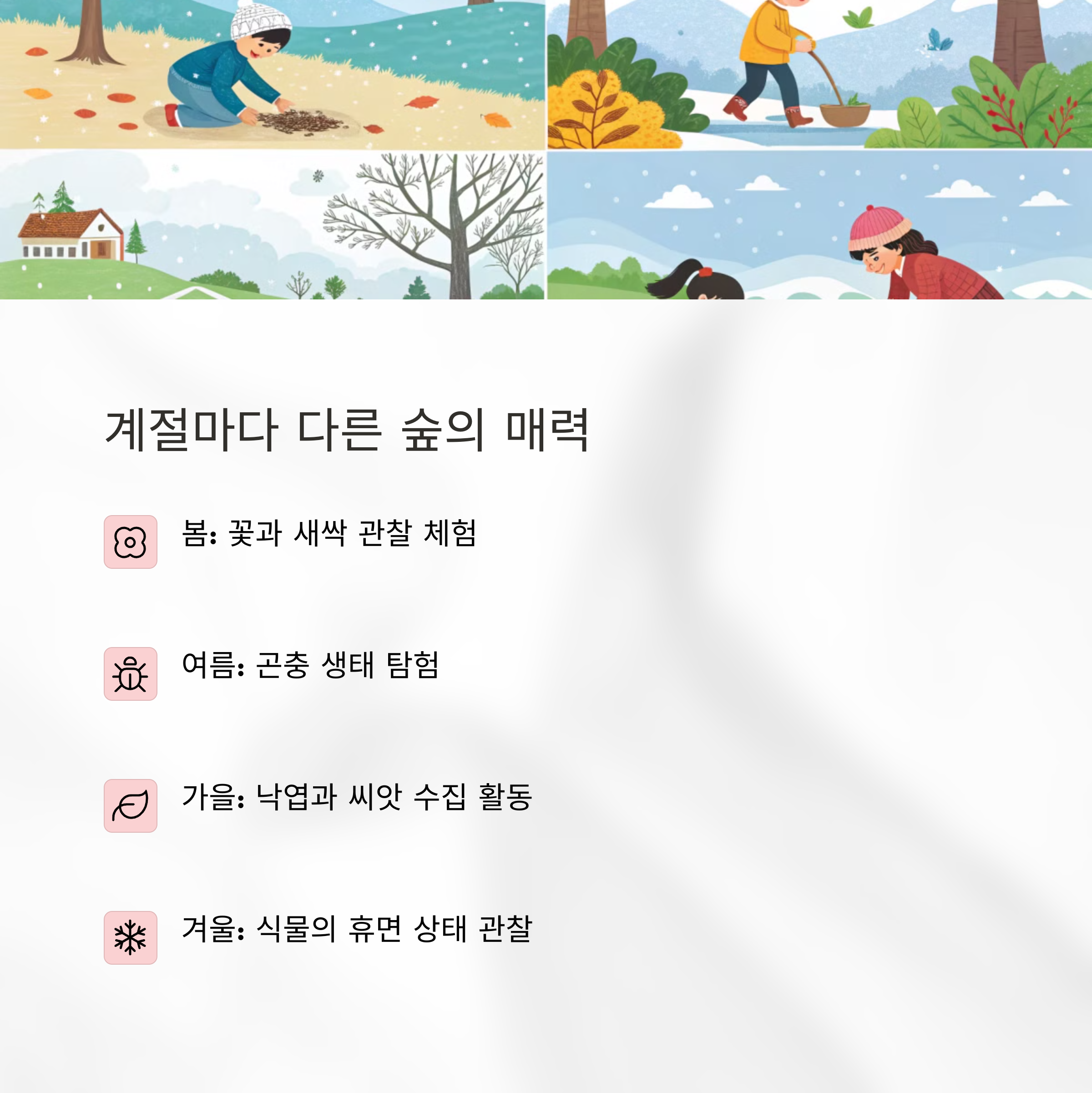 프로그램은 계절마다 테마가 달라지는 점이 특징이에요. 봄에는 새싹 찾기, 여름엔 물놀이 활동, 가을에는 낙엽 모으기, 겨울엔 동물 흔적 찾기 등 매번 다른 테마로 구성되어 있어 반복 방문해도 지루하지 않아요. 모든 활동은 실외에서 이루어져 자연과 직접 부딪히며 배우게 되고, 이는 아이들에게 도전정신과 생태 감수성을 길러주는 데 아주 효과적입니다.