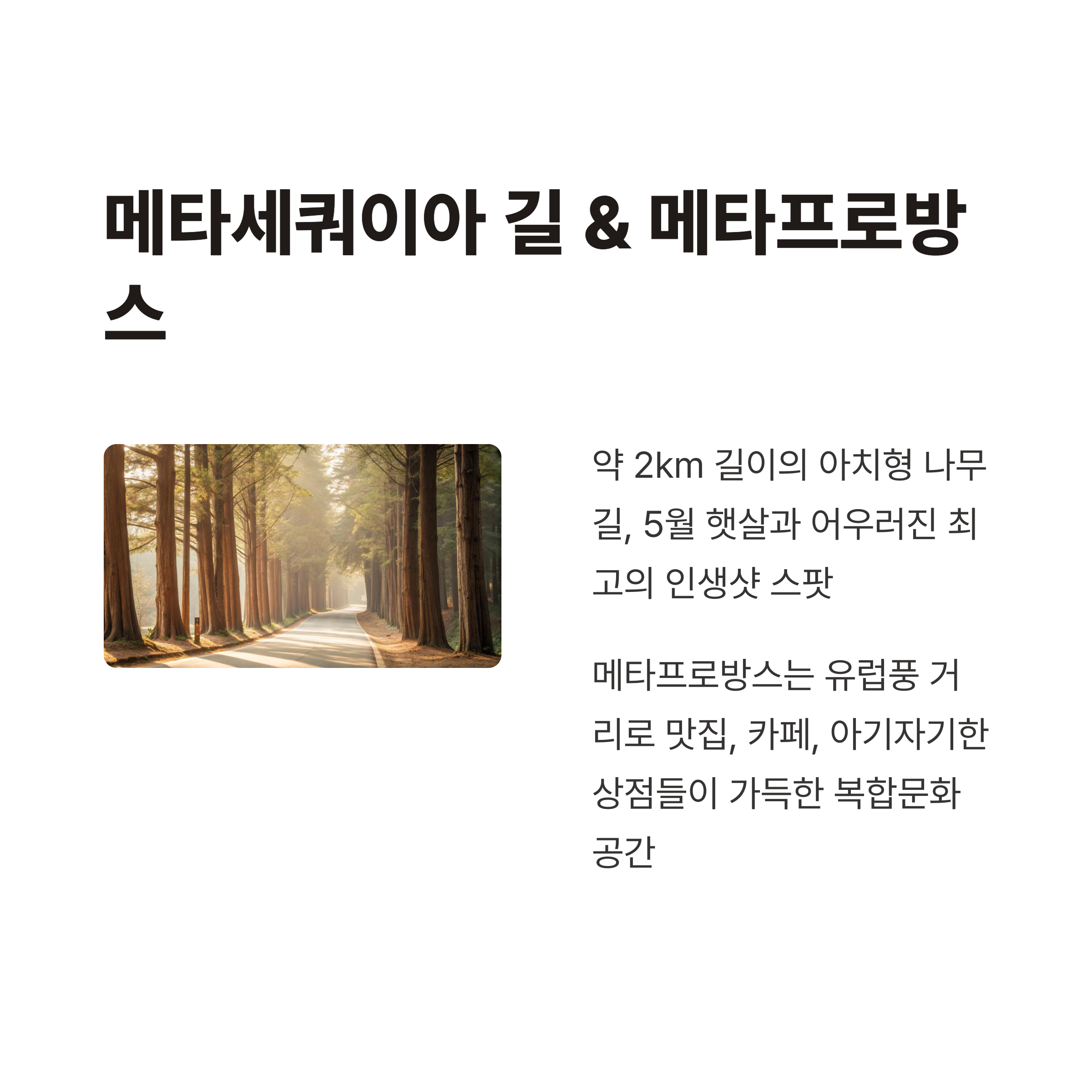 메타세쿼이아 길 & 메타프로방스 – 이국적 감성의 인생샷 명소