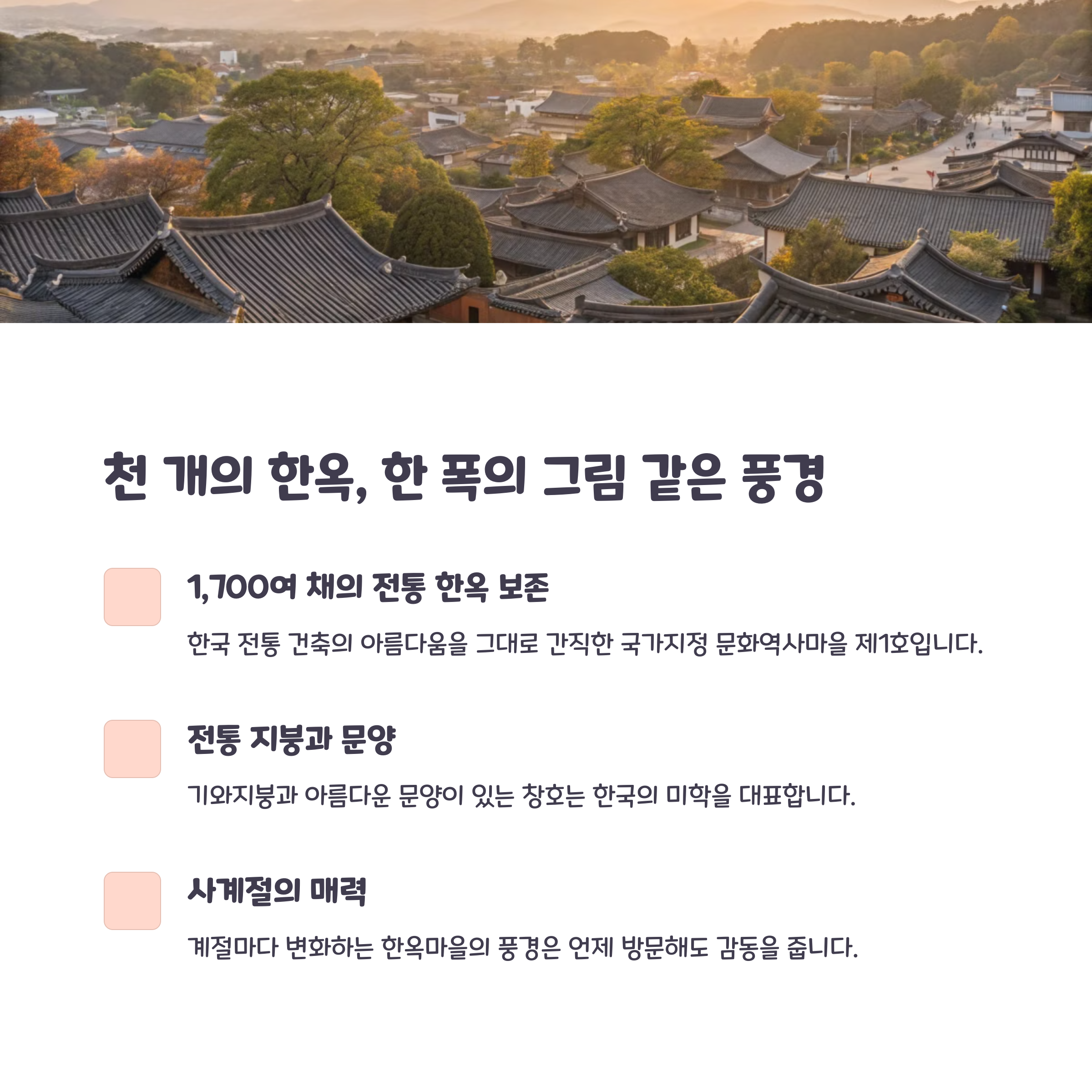 전통이 살아 숨 쉬는 한옥 건축 양식과 분위기 | 조급함 없이 천천히 걸으며 느끼는 여유로움 | 감성을 자극하는 골목과 풍경의 조화 |