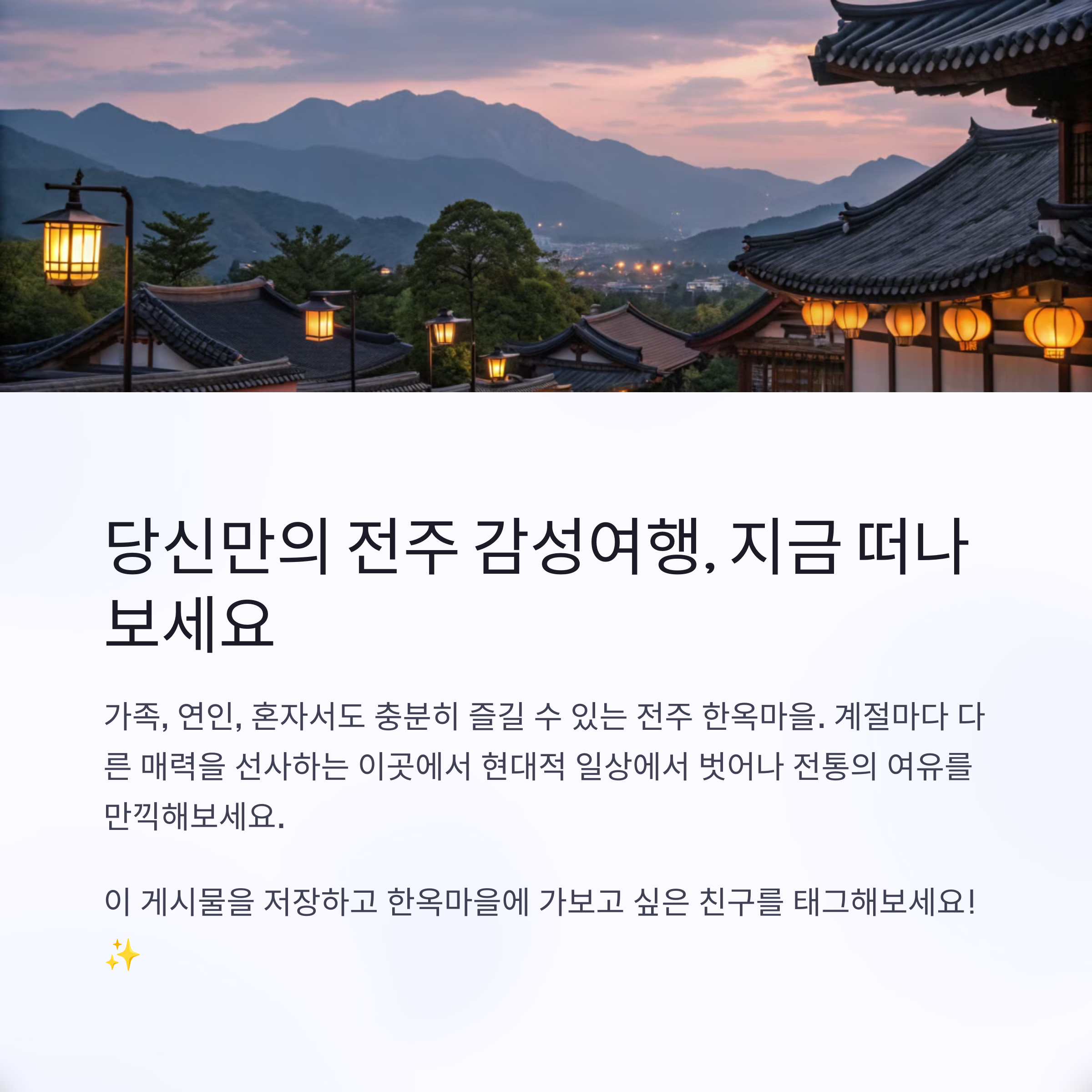 전주 한옥마을은 단순한 여행지를 넘어서 우리의 감정을 치유하고 회복시켜주는 공간입니다. 조용히 걷기만 해도 위로받는 이 기분, 그것은 말로 설명하기보다는 직접 느껴보아야 비로소 이해할 수 있습니다. 한옥의 멋, 사람들의 미소, 자연의 품 그 안에 담긴 모든 것이 여러분을 기다리고 있습니다. 이제는 더 이상 고민하지 말고, 전주의 길 위에서 천천히 자신을 만나보세요.