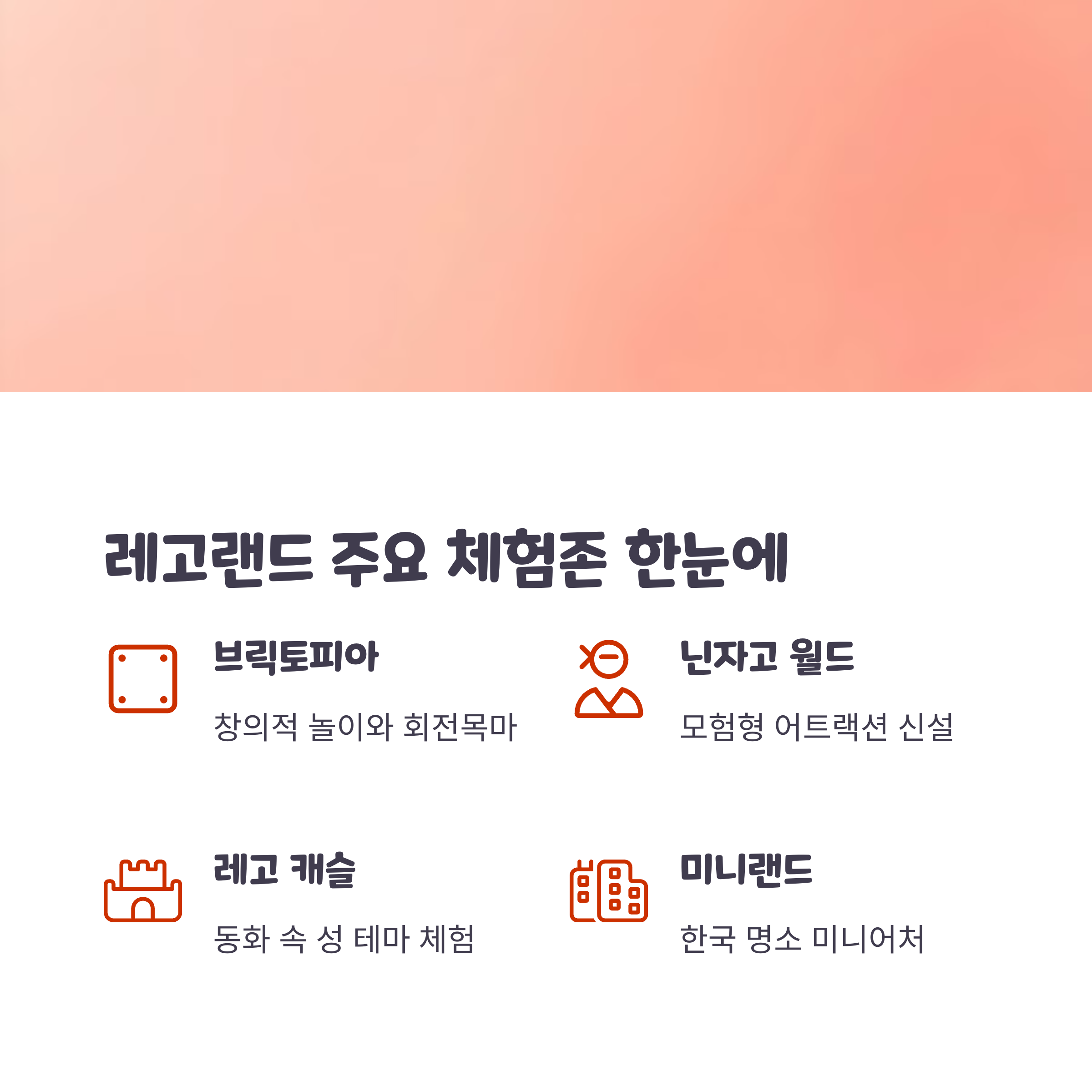 레고랜드에는 브릭토피아, 레고 캐슬, 닌자고 월드 등 테마별 체험존이 다양하게 마련되어 있습니다
