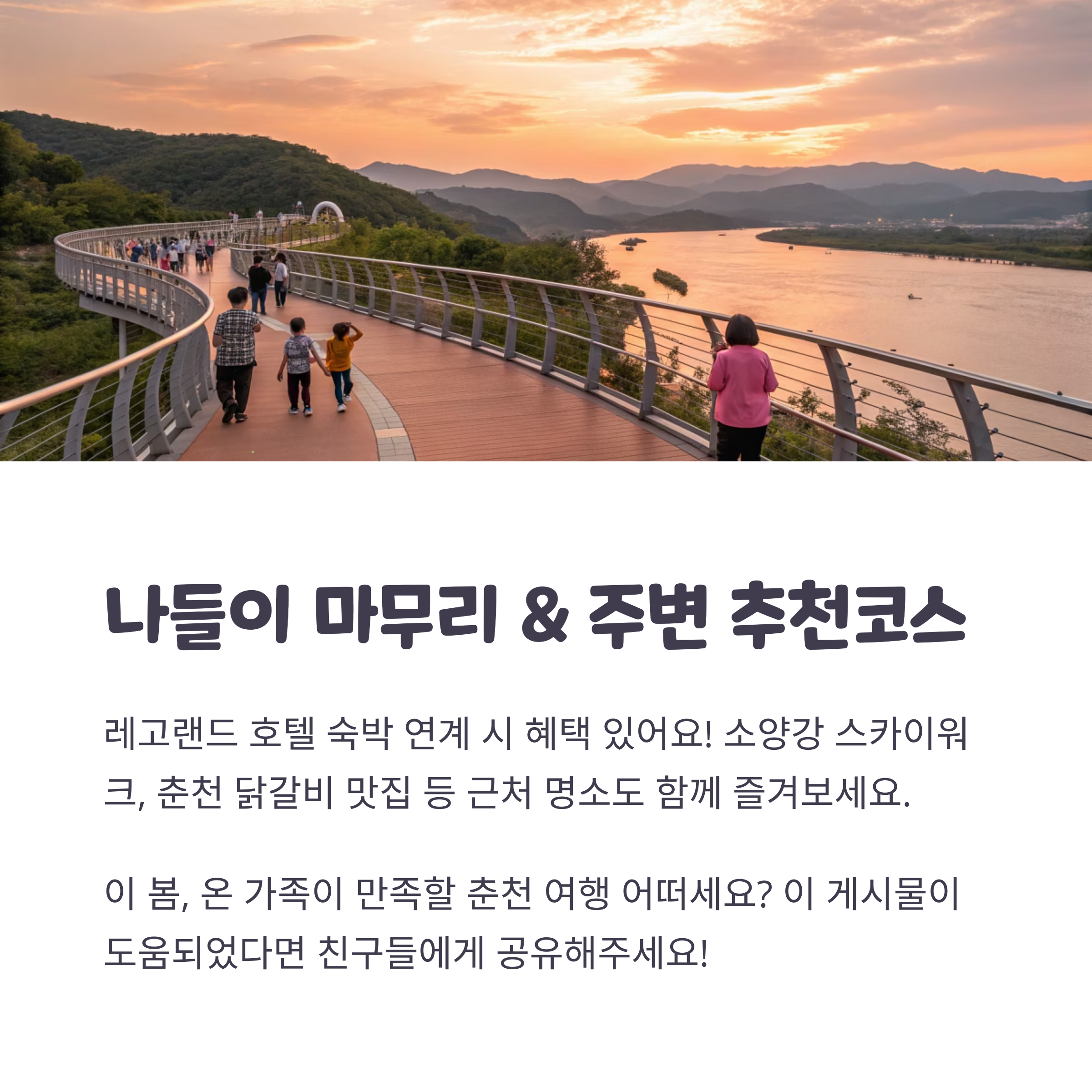 레고랜드 관람 후에는 근처 소양강 스카이워크, 남이섬, 춘천 닭갈비 골목도 함께 둘러보세요