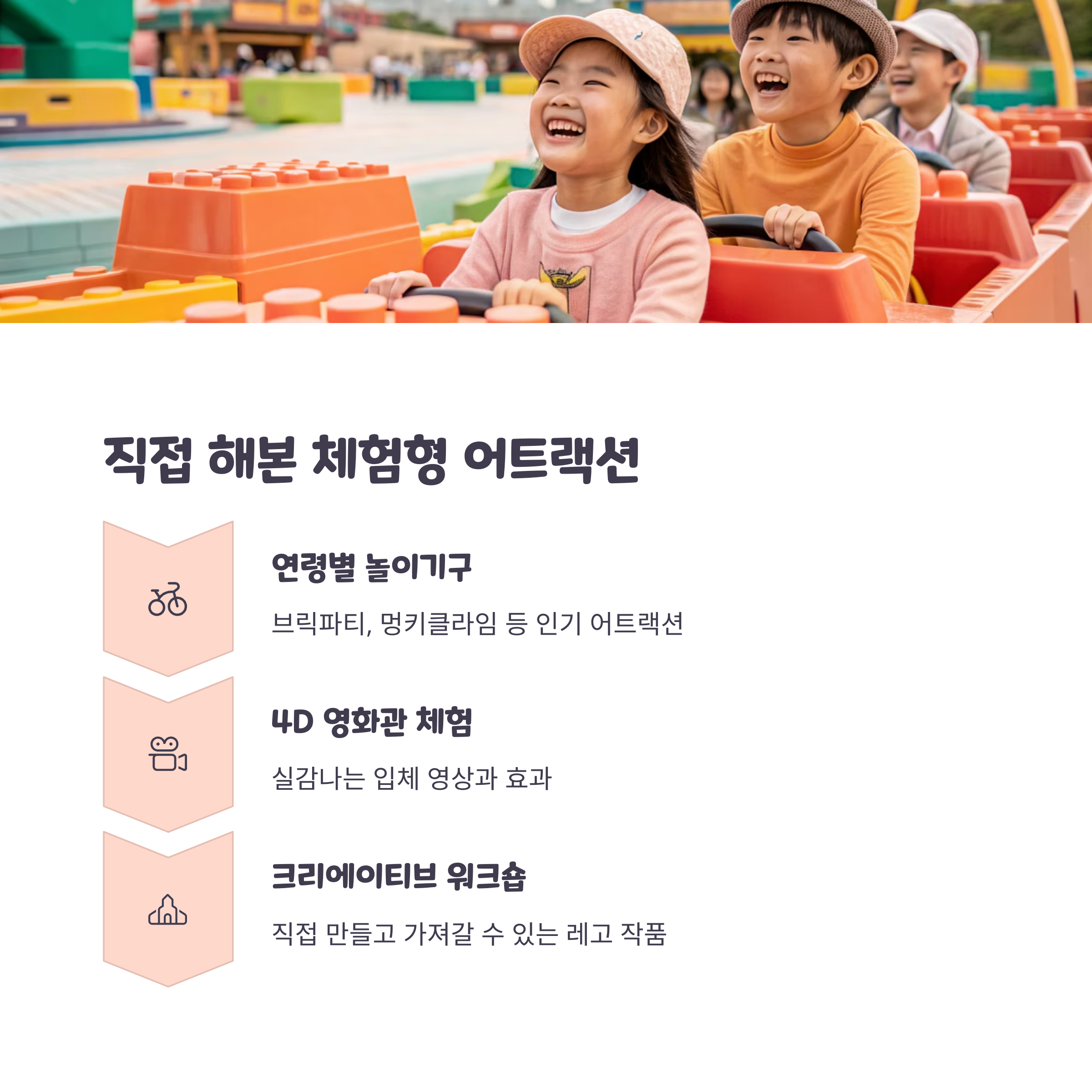 다양한 놀이기구와 레고로 꾸며진 환상적인 공간, 그리고 세심하게 준비된 가족 중심의 동선까지 갖추고 있어요