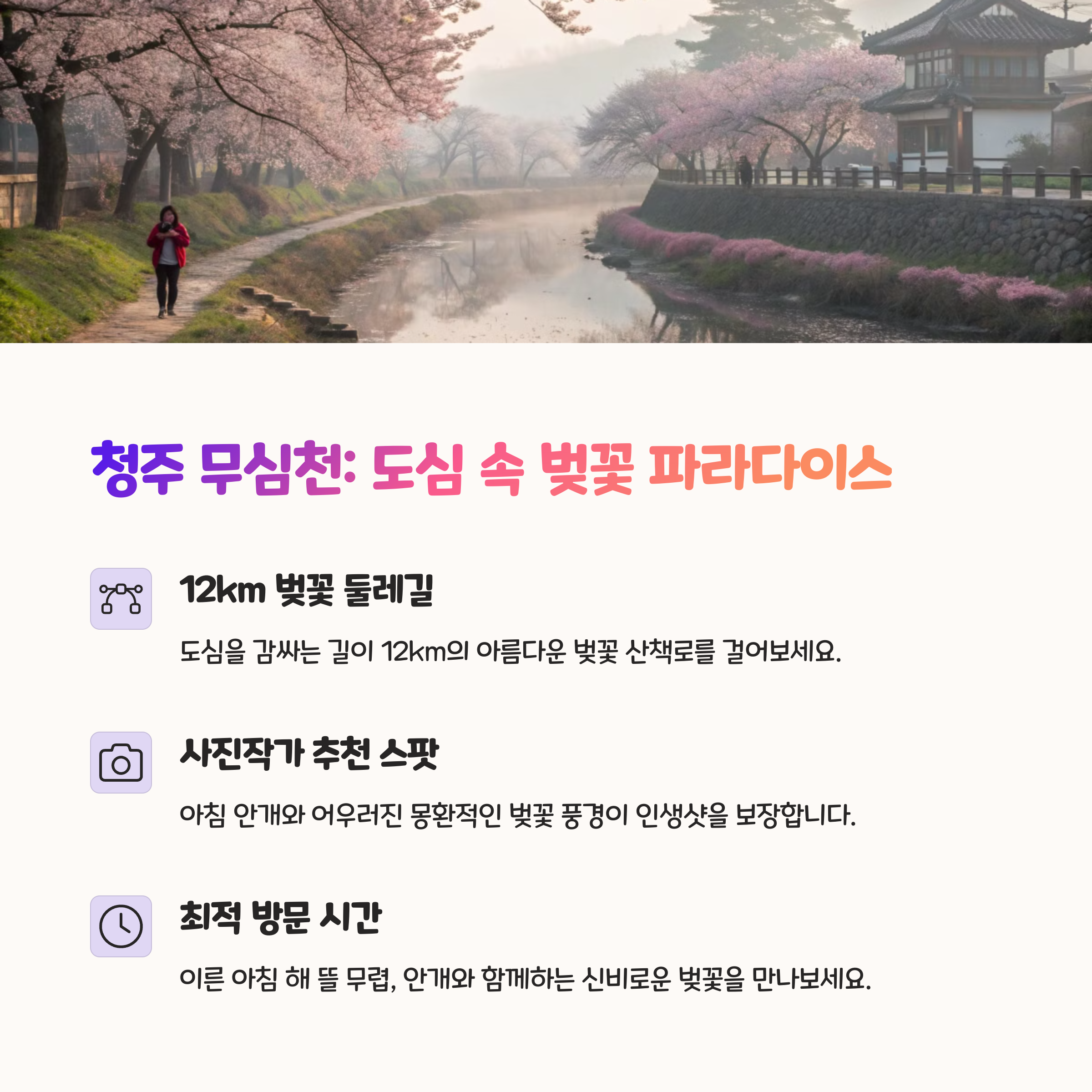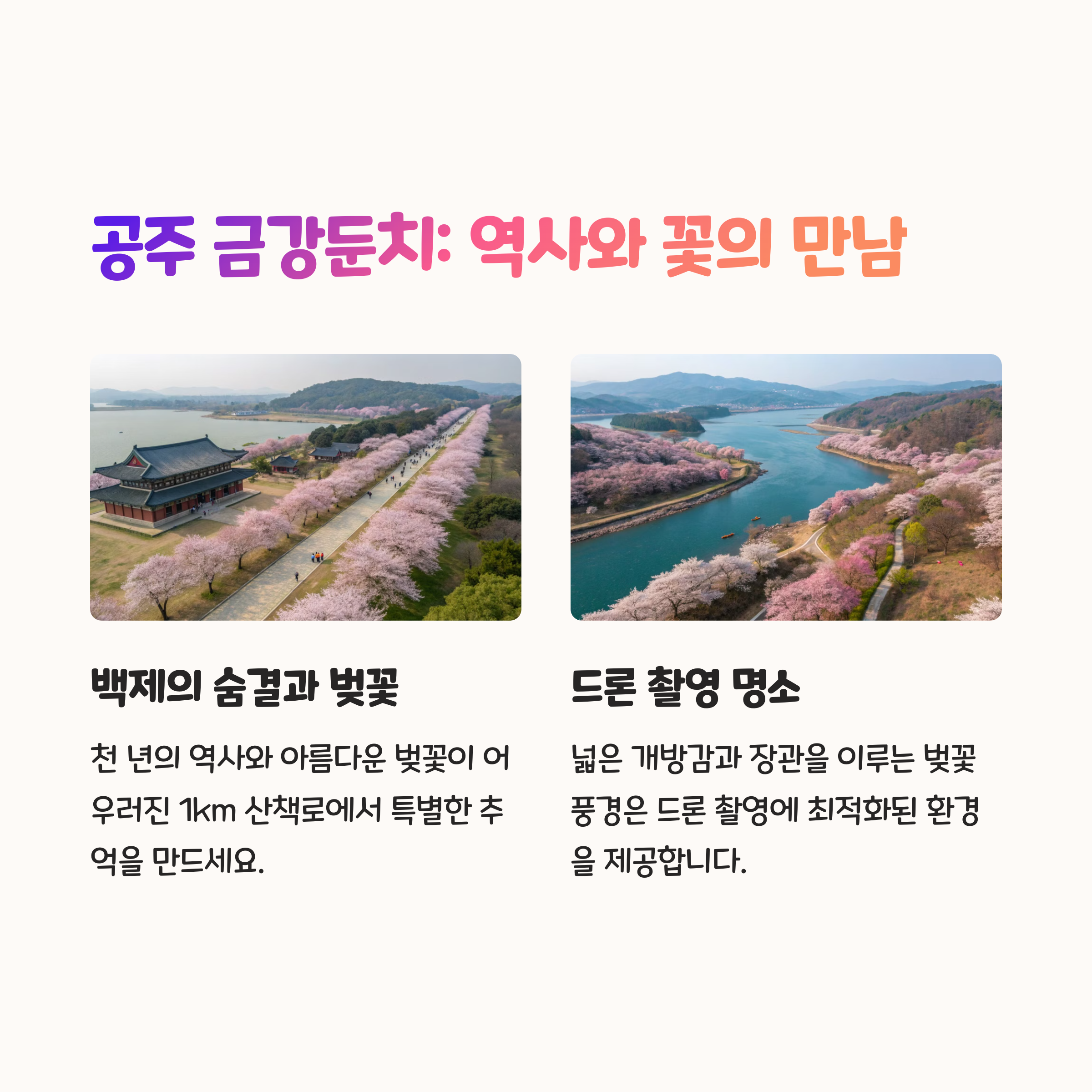사진을 잘 찍고 싶다면, 해가 높지 않은 아침 시간이나 해질 무렵의 부드러운 햇살을 활용하세요. 특히 청주 무심천 벚꽃길은 강을 따라 벚꽃이 이어져 있어 강 반영을 이용한 사진 구도가 좋고, 공주의 금강 둔치는 일몰 타이밍과 함께 하늘이 붉게 물들어 감성적인 사진을 찍기에 최적입니다. 드론 촬영이 가능한 장소도 일부 있으니, 관련 규정을 확인하고 방문하는 것도 좋습니다.