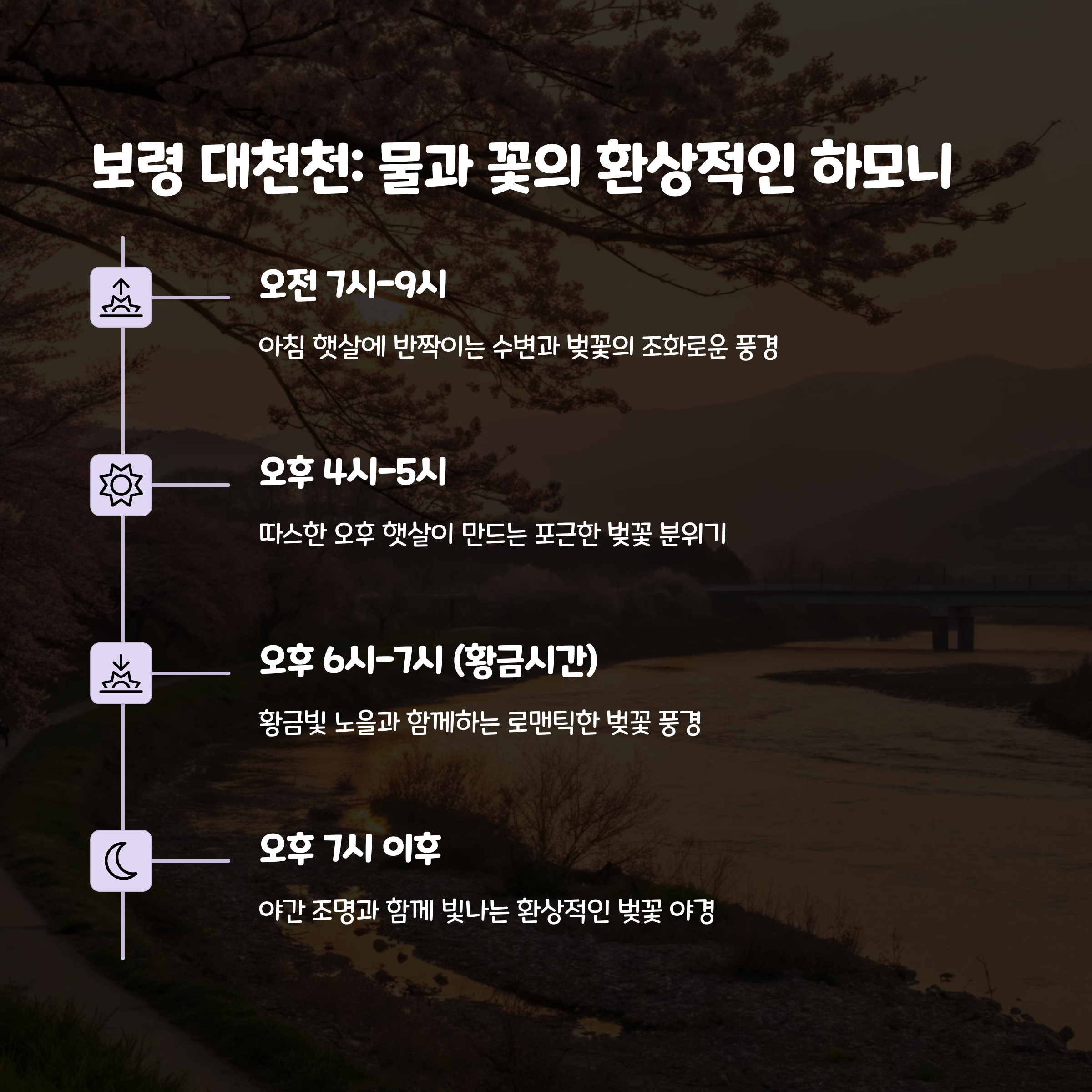 | 3월 말~4월 초, 지역에 따라 상이 | 공주 금강둔치, 청주 무심천, 보령 대천천 | 일출·일몰 시간대, 강 반영, 드론 촬영 |