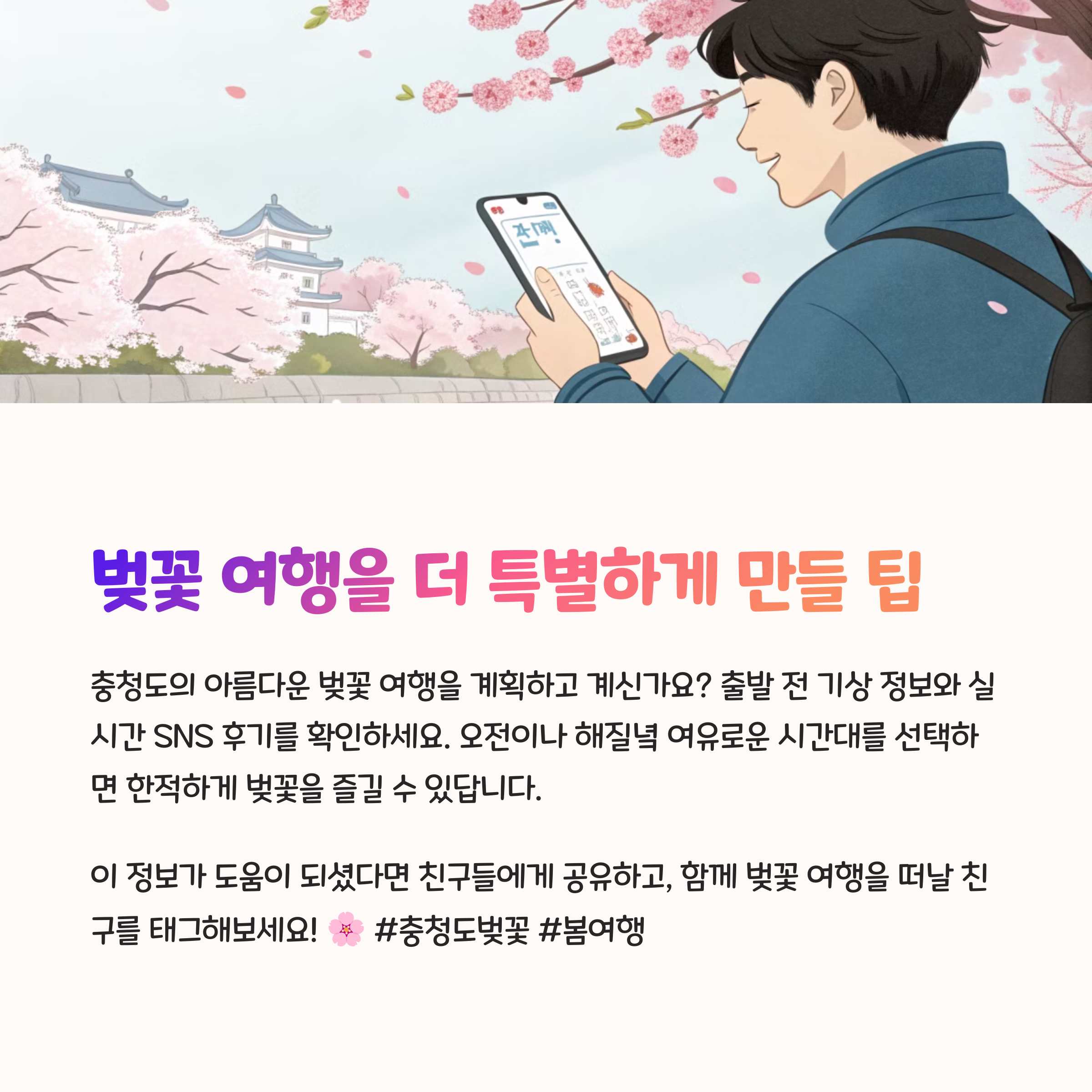 충청도 벚꽃 명소 중 가보신 곳이 있나요? 혹은 추천하고 싶은 다른 명소가 있으신가요? 여러분만의 봄꽃 여행 팁이나 감상 후기도 댓글로 남겨주세요! 서로의 경험이 좋은 여행 길잡이가 됩니다.