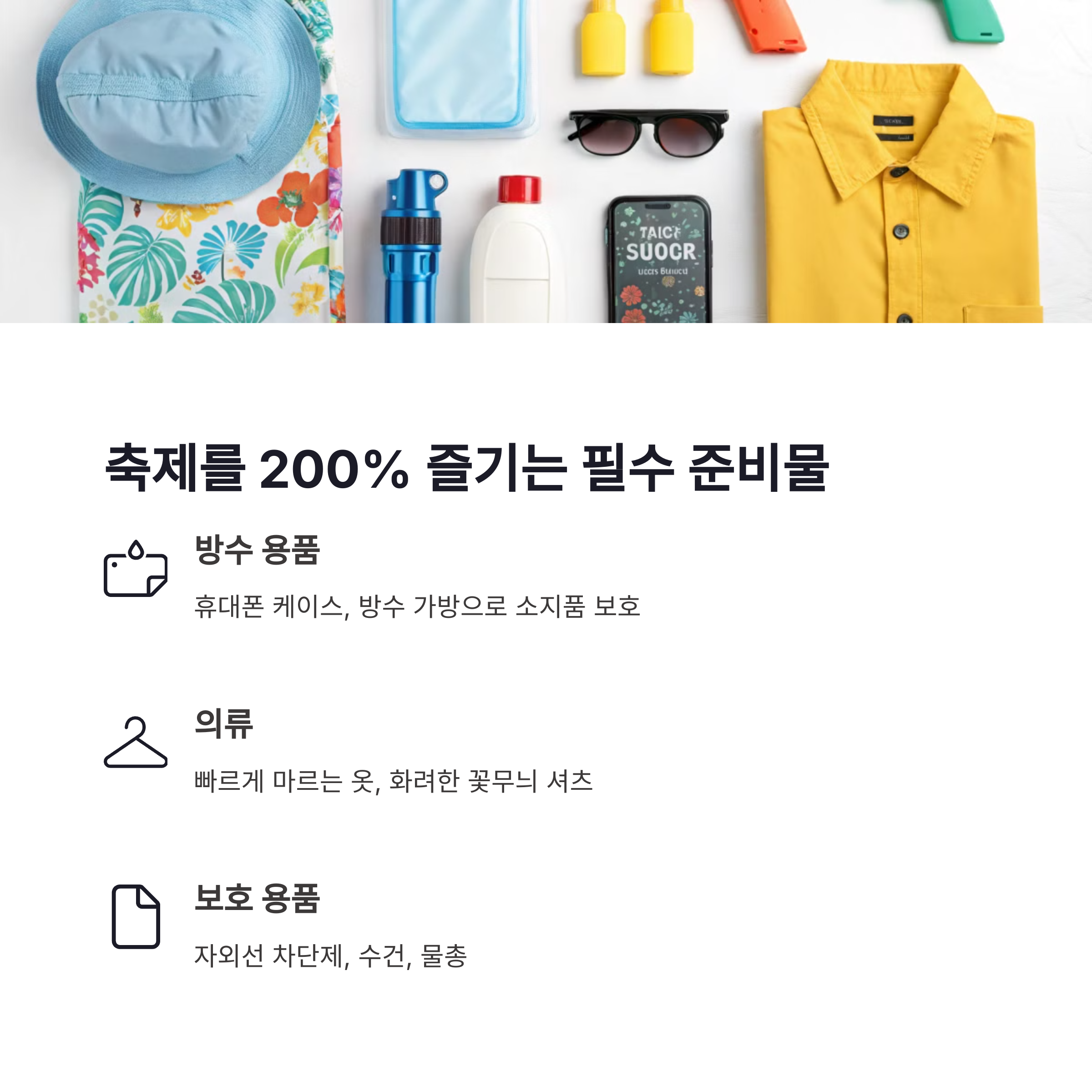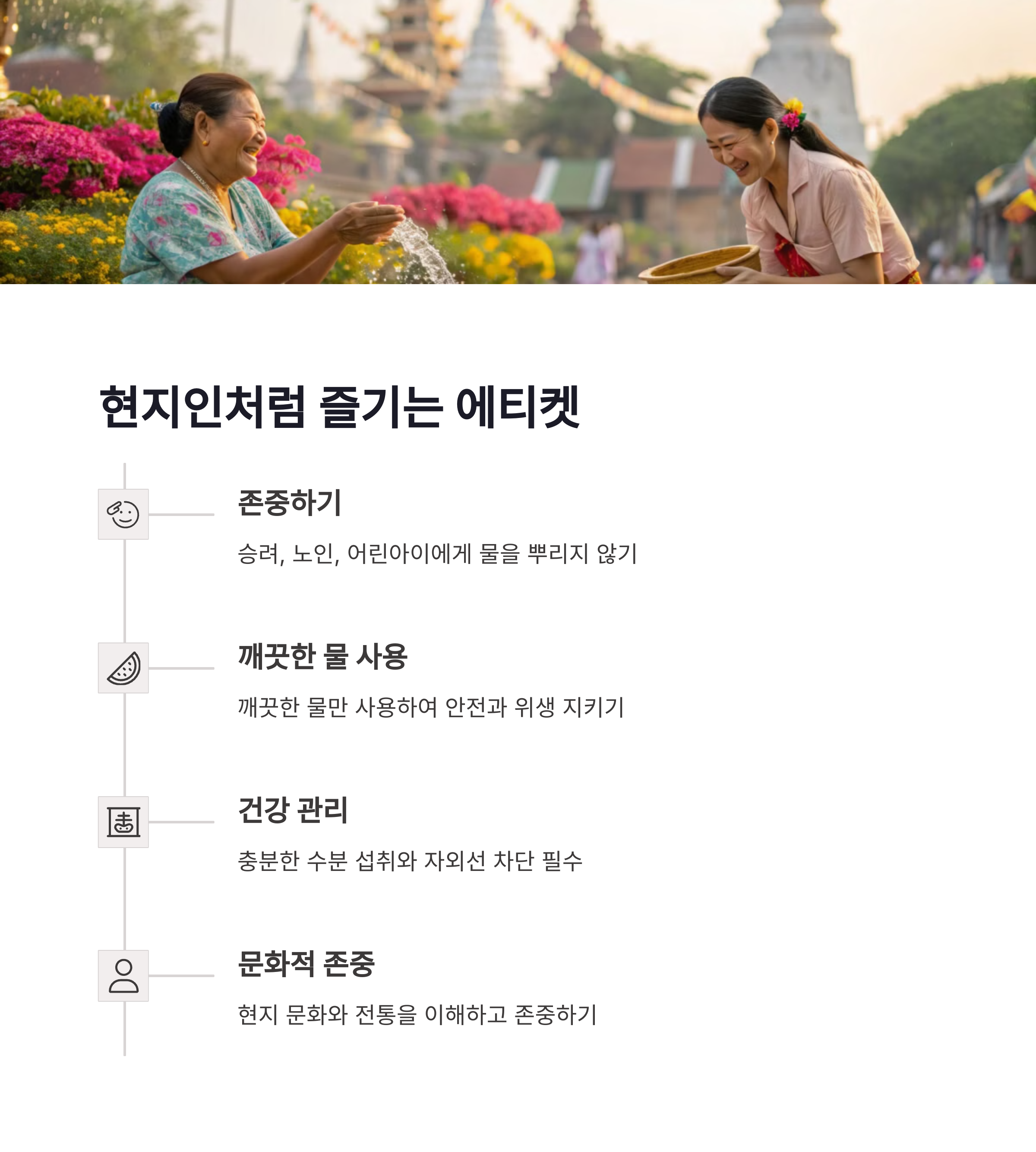 | 방콕 카오산, 치앙마이 타페게이트 추천 | 방수팩, 물총, 기능성 옷, 방수신발 필수 | 현지인 존중, 과도한 음주·난동 주의 |