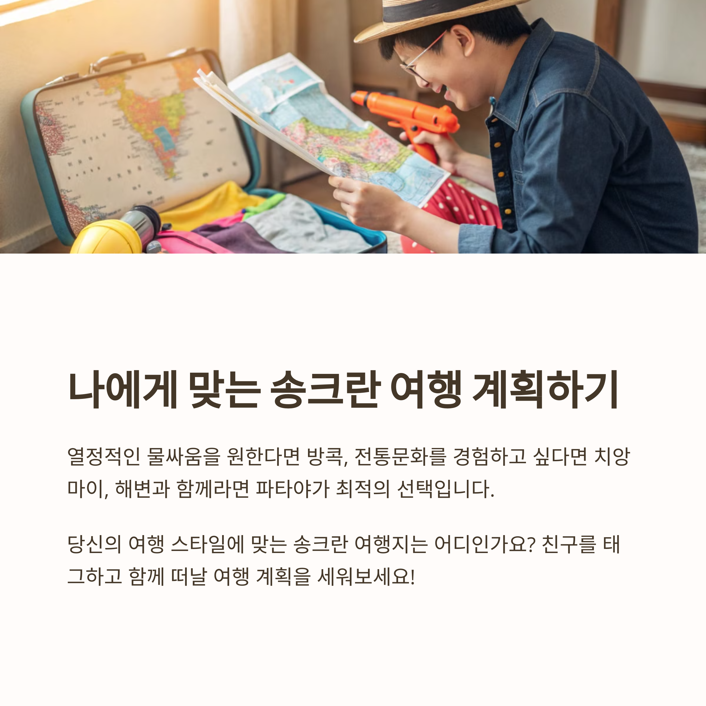 태국 송크란 축제는 단순한 물놀이가 아닌 문화와 전통, 그리고 사람들의 따뜻한 마음이 어우러지는 감동적인 경험입니다. 여행 스타일에 맞게 도시를 선택하고, 즐거움과 안전을 모두 고려해 여행 일정을 계획해보세요. 방콕의 열정, 치앙마이의 전통, 파타야의 자유로움 중 어느 것이든 최고의 추억이 될 것입니다. 이번 송크란에서는 나만의 특별한 여행을 만들어 보세요!