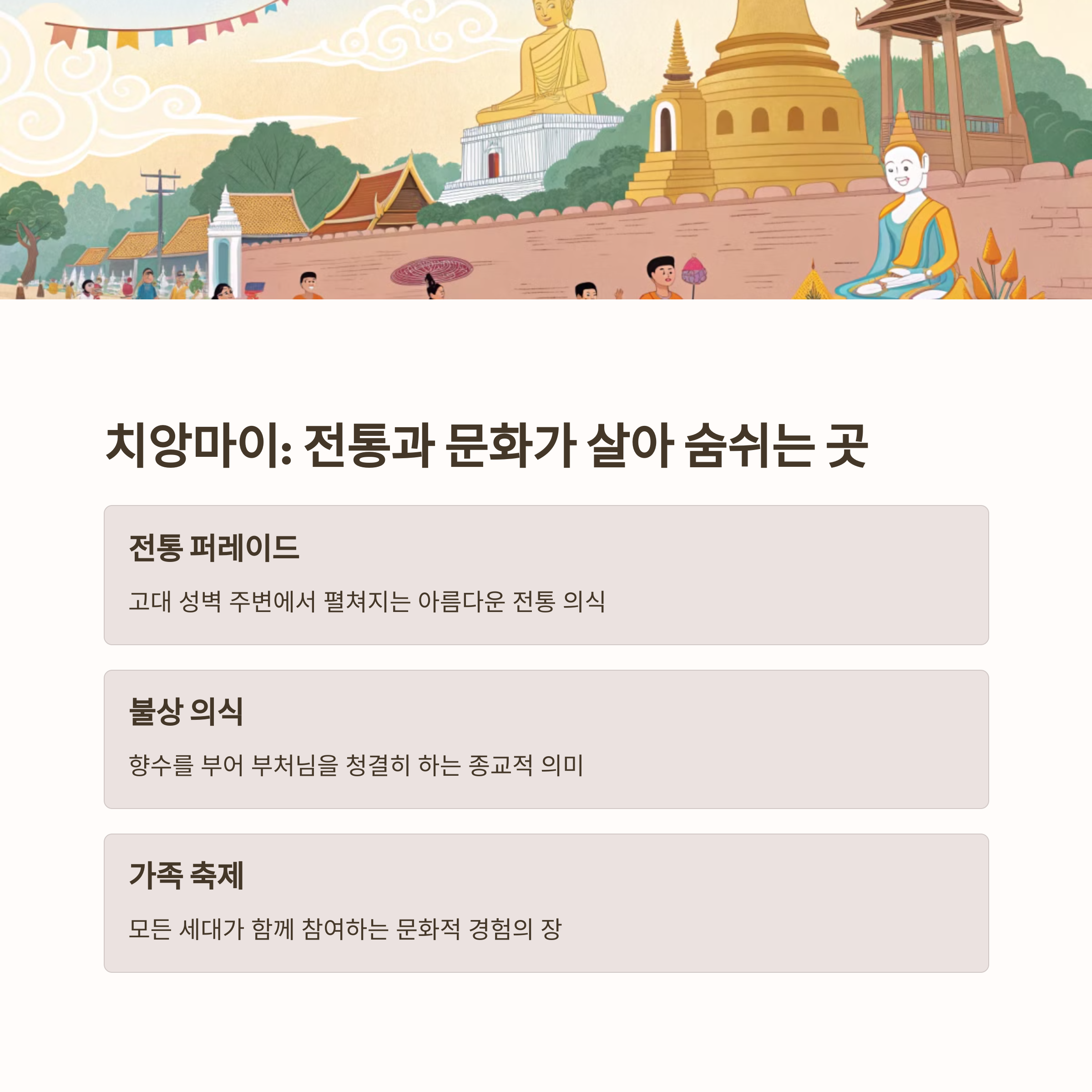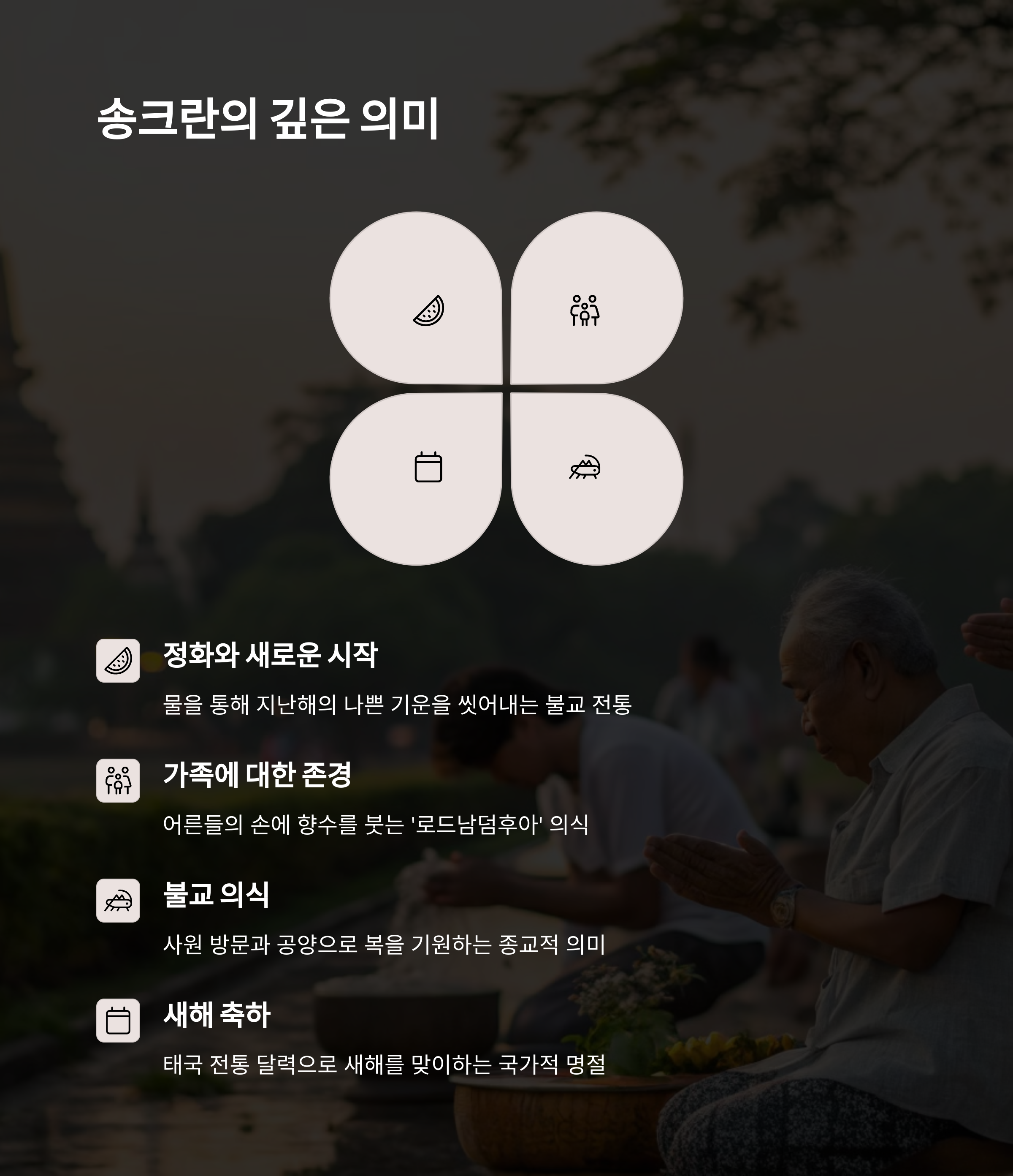 | 송크란 축제란? | 태국의 설날로, 물을 뿌리며 새해를 축하하는 전통행사 |