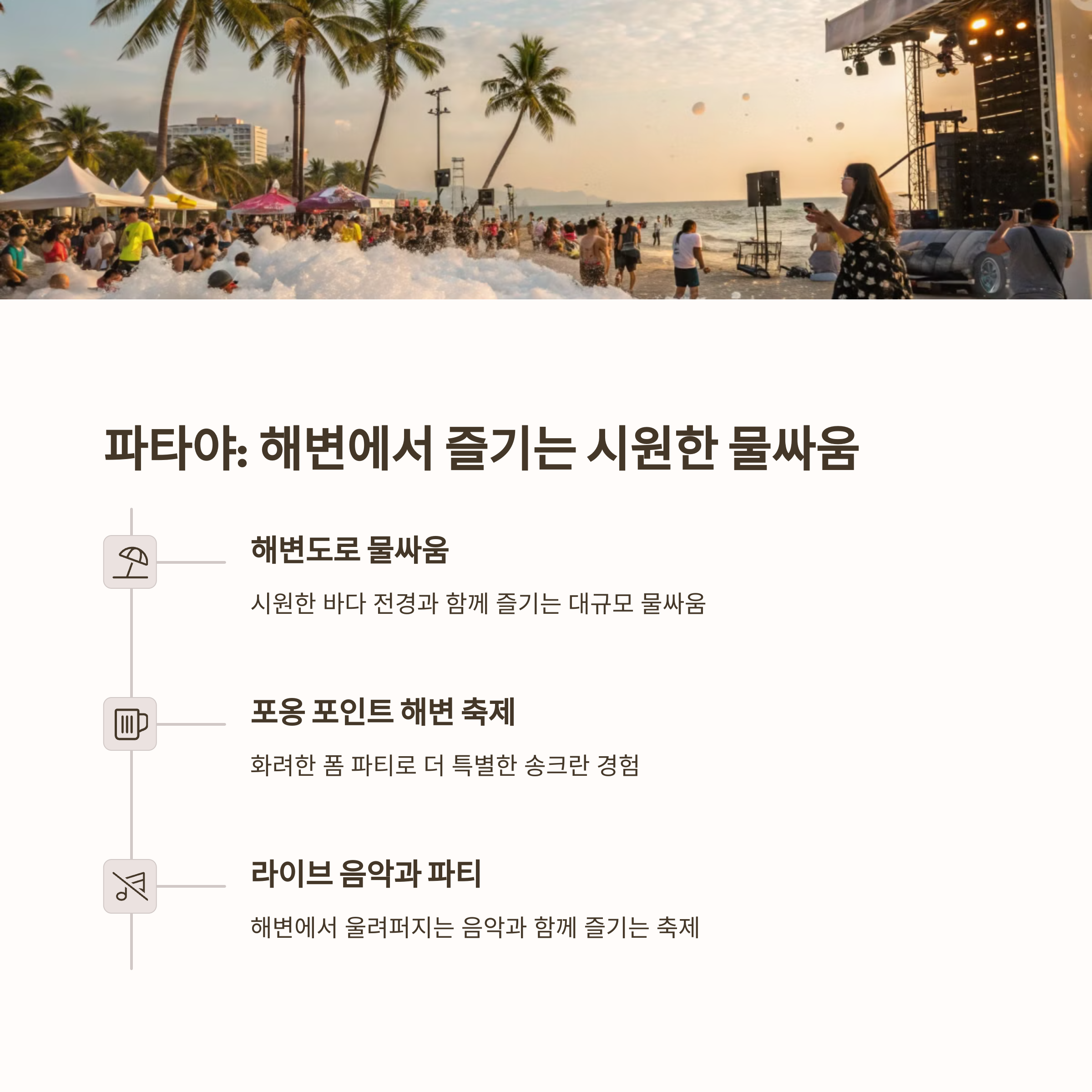 도심 속 화려한 퍼레이드와 대규모 파티 | 전통 중심의 정갈한 물축제 분위기 | 해변가에서 열리는 자유로운 축제의 장 |