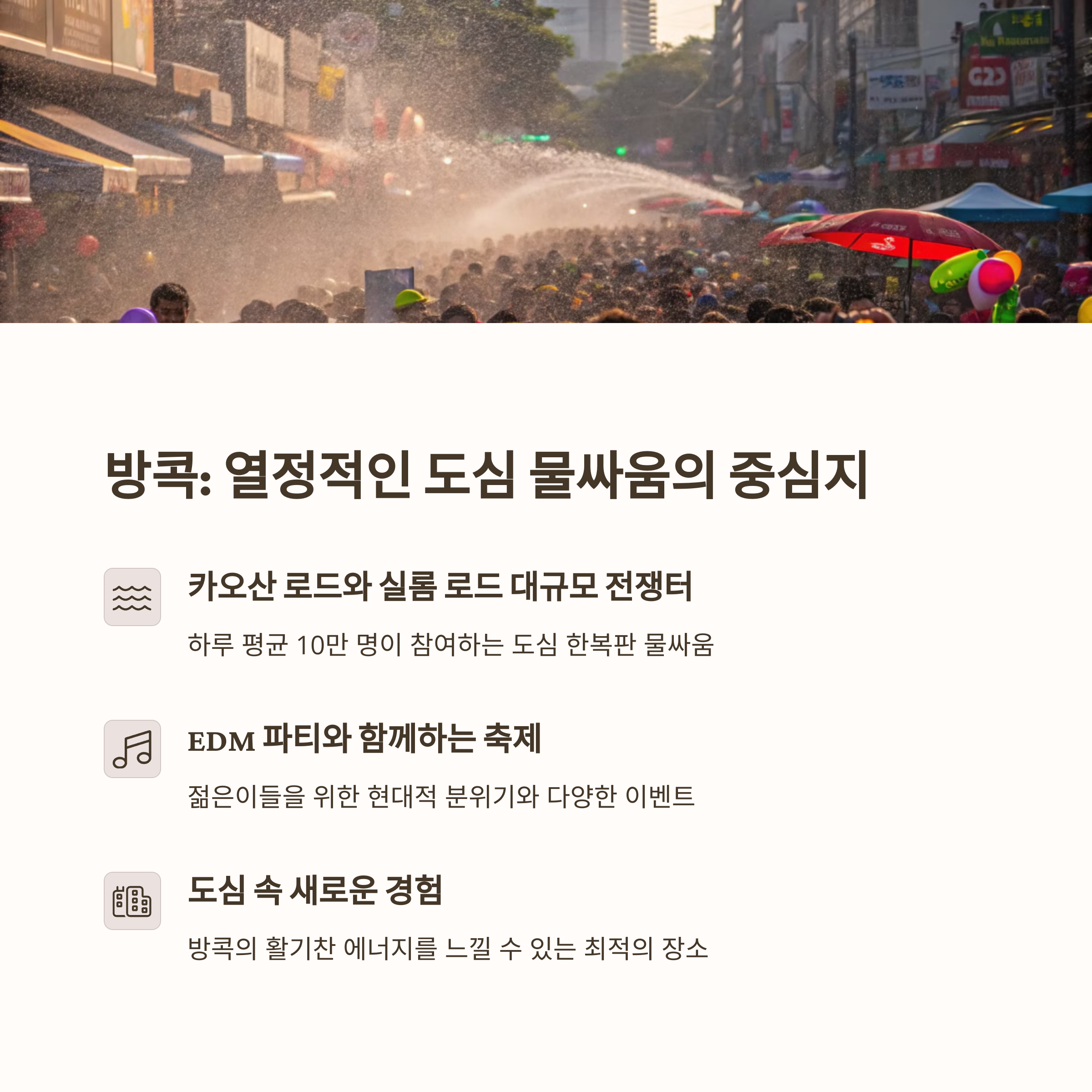 | 도심 속 화려한 퍼레이드와 대규모 파티 | 전통 중심의 정갈한 물축제 분위기 | 해변가에서 열리는 자유로운 축제의 장 |